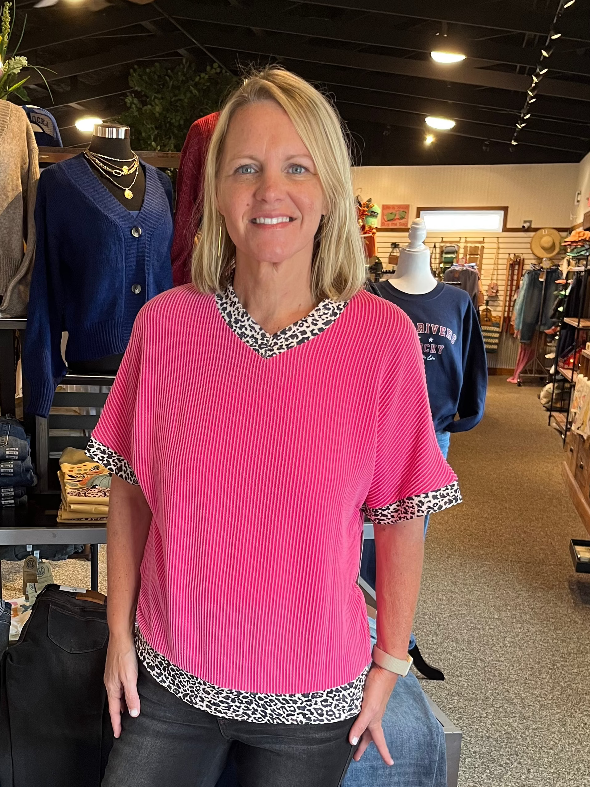 Add a splash of fun to your wardrobe with this bright pink and leopard patchwork V-neck t-shirt. Featuring a unique corded texture, it combines bold patterns with a playful vibe, perfect for standing out in any crowd. Comfortable and eye-catching, this tee brings a lively twist to your everyday style.