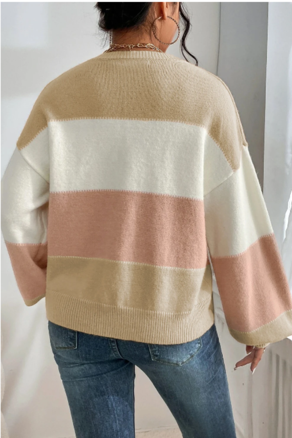 Bring fun and flair to your wardrobe with this color block sweater that celebrates bold style. Vibrant stripes pop against contrasting panels, while the distinctive lantern sleeves create a playful silhouette that turns heads. The drop shoulder design delivers that relaxed, modern vibe—dress it up or down and let your personality shine through.