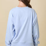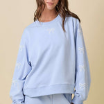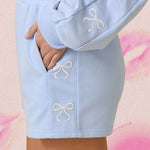 This playful long-sleeve crewneck top features charming ribbon bow embroidery on the center and sleeves, perfectly matched with coordinating shorts. Crafted from a soft blend of 50% cotton and 50% polyester in a light blue hue, this set offers comfort and style for relaxed days and fun adventures.