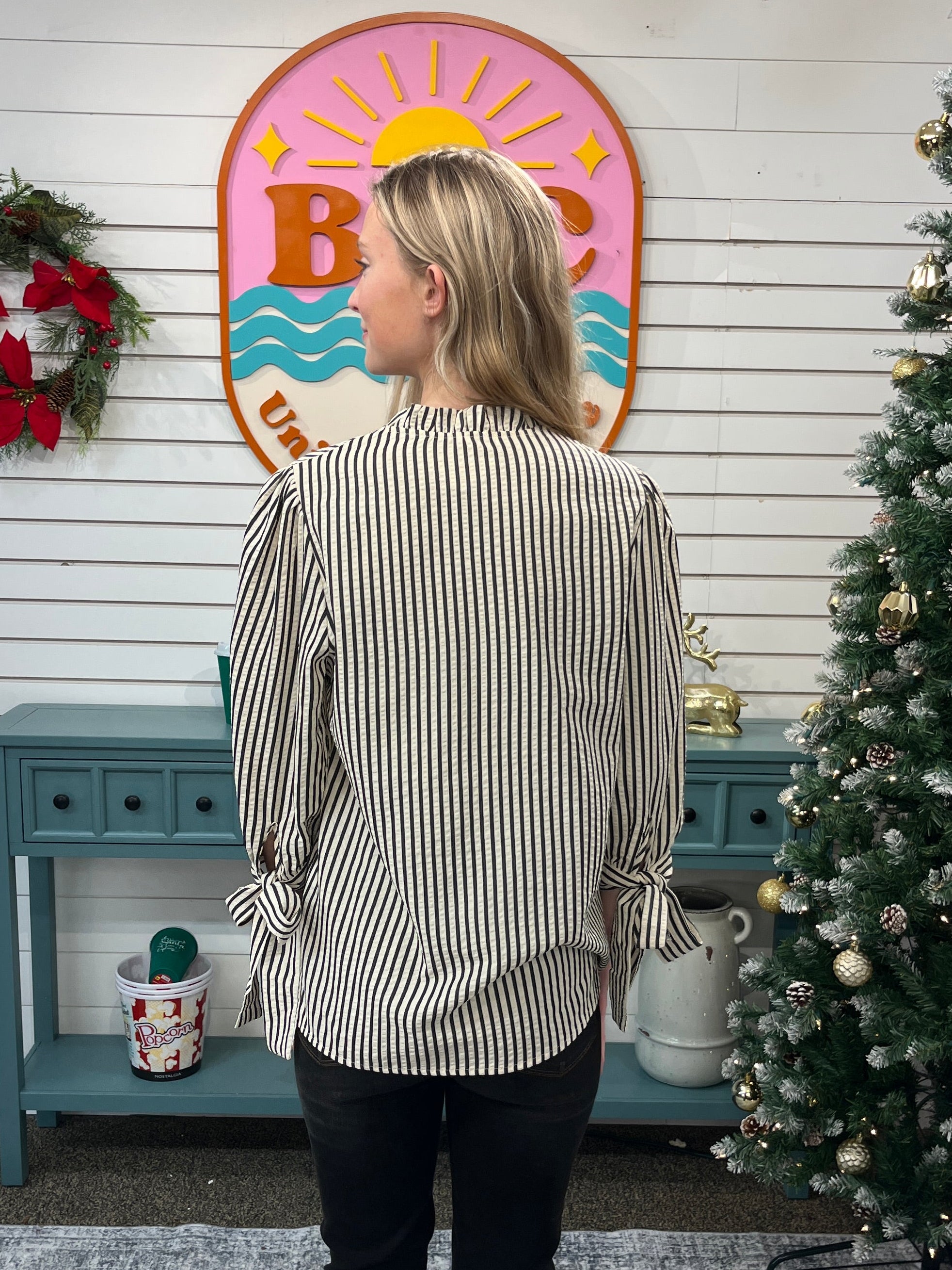 Make a statement with this delightfully fun striped blouse that's anything but ordinary. The frilled V neckline draws the eye while the adjustable open tie knot lets you control the vibe—cinch it tight for drama or leave it loose for effortless charm. Three-quarter sleeves provide the perfect sweet spot between coverage and breathability, making this your go-to piece for mixing sophistication with a dash of playful flair.