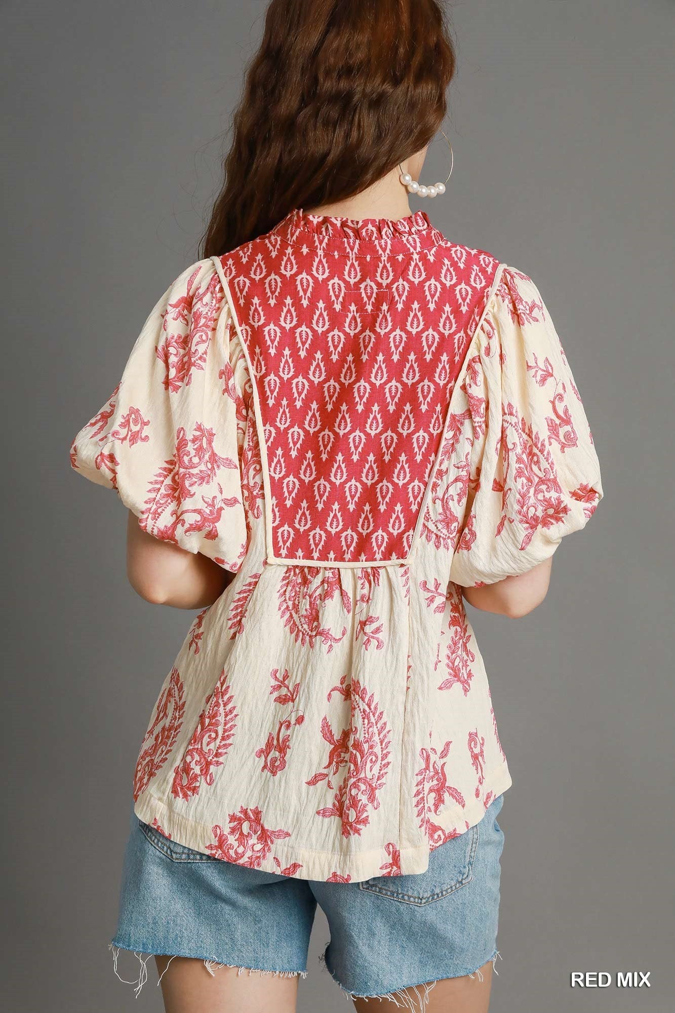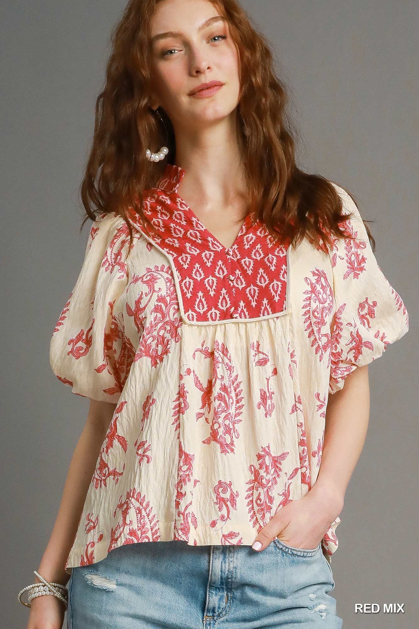 Unleash your inner bohemian with this eye-catching red top! featuring a captivating blend of mixed patterns that dance across the fabric, playful puff sleeves that add just the right amount of drama, and a flirty open v-neck that frames your neckline perfectly. this boho-inspired piece brings carefree vibes to any outfit—perfect for those who aren't afraid to stand out!