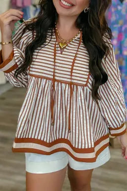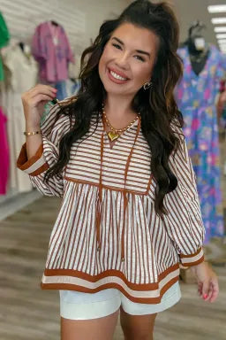 Embrace playful charm with the Striped Baby Doll Blouse, designed with a flirty drawstring V-neck and breezy open cuff long sleeves. The contrasting solid accents add a fun twist, making this blouse an ideal choice for cozy fall days or casual outings where you want to show off your lively personality.