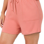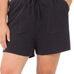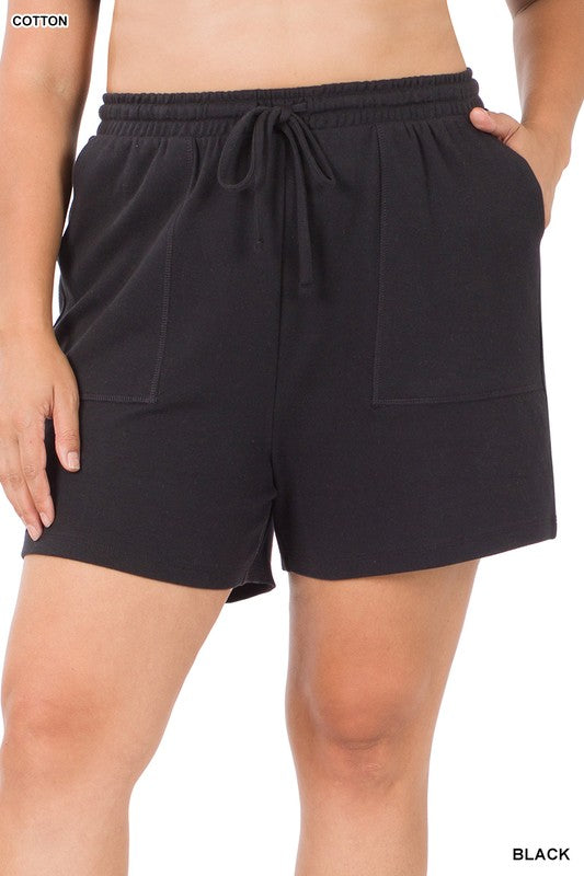 Drawstring waist shorts with pockets, relaxed fit. 60% cotton/40% spandex