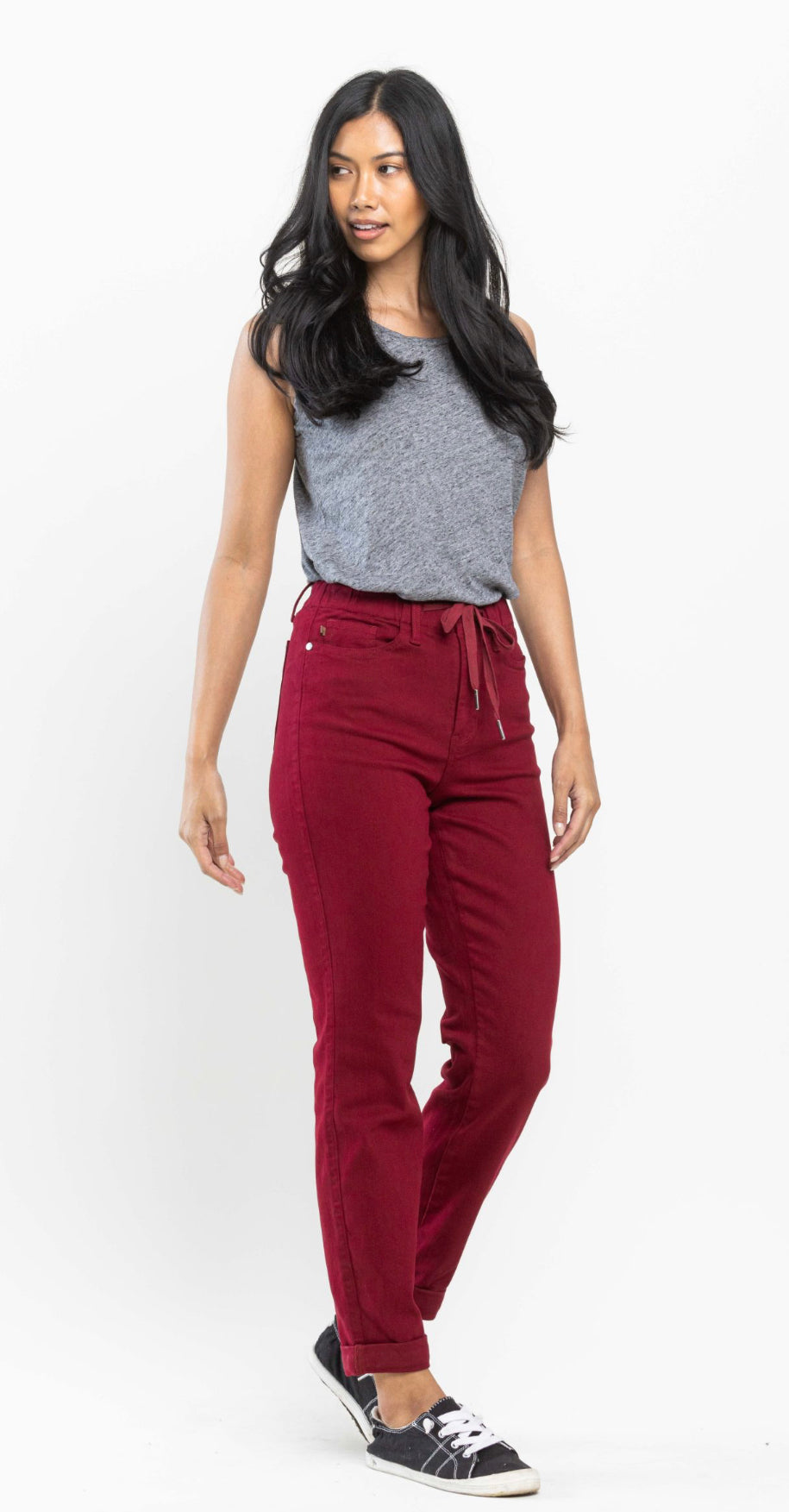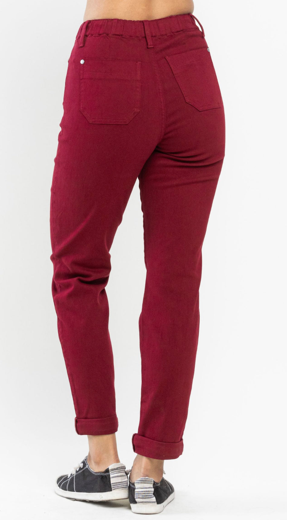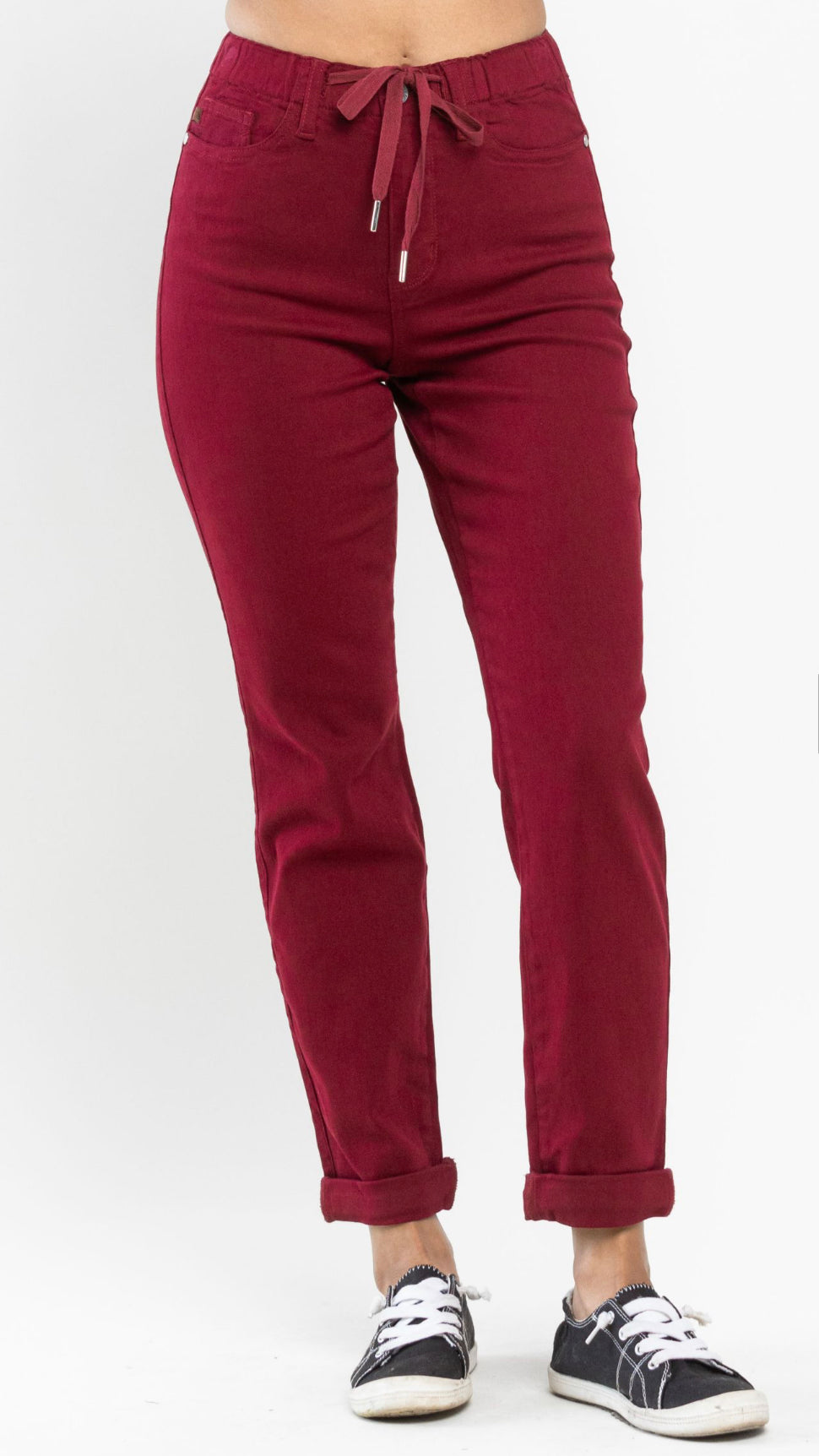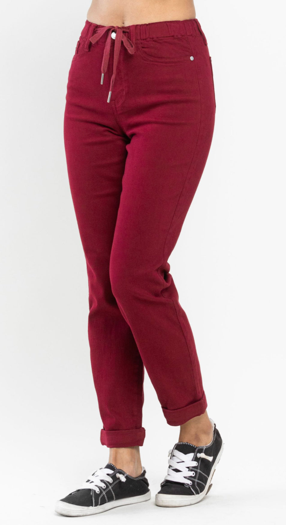 Step into vibrant comfort with the Judy Blue Cranberry Jogger. This playful stretch jean jogger pops in a beautiful cranberry shade, featuring trendy cuffed ankles and handy pockets for your essentials. Perfect for lounging or casual outings, these jean joggers blend style and ease effortlessly.