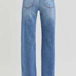 Tummy control elastic band high rise wide jeans. They are medium in color. Rise is 10-1/2", inseam is 33" in size 3/26. Model below is wearing a size 1.