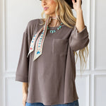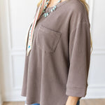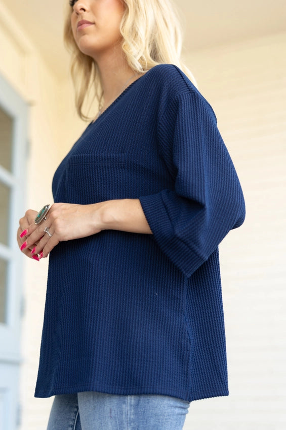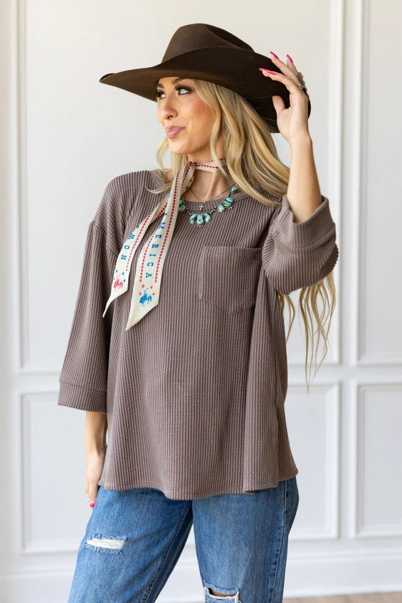 Give your casual style a fun boost with this charming 3/4 sleeve top, featuring a cozy round neck and soft ribbed fabric. Pick your favorite—deep navy or warm mocha—to suit your vibe. Its flowy fit lets you move freely while keeping things light and breezy all day long. Ideal for relaxing or layering up with a playful flair!
