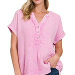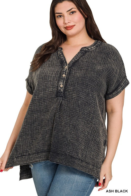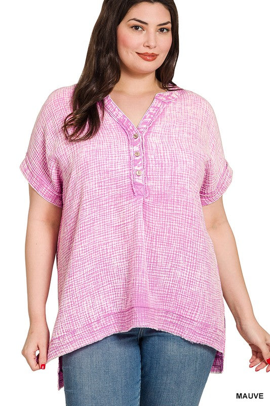 Keep it casual and cool with our Double Gauze Henley Shirt. The 3/4 button v neck adds a touch of style, while the raw edge hi low hem and side slits provide a relaxed fit for all-day comfort. Perfect for weekend adventures (or just lounging around). (Trust us, you'll love it).
