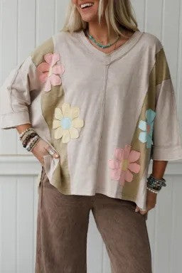 Brighten your day with the Flower Patch Exposed Seam Top! This playful V-neck features eye-catching big flower patches that add a burst of charm, while the 3/4 sleeves keep it breezy and fun. Perfect for mixing bold floral vibes with casual comfort.