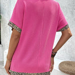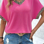 Add a splash of fun to your wardrobe with this bright pink and leopard patchwork V-neck t-shirt. Featuring a unique corded texture, it combines bold patterns with a playful vibe, perfect for standing out in any crowd. Comfortable and eye-catching, this tee brings a lively twist to your everyday style.