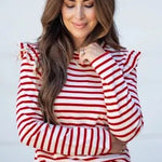 Get ready to turn heads with this delightful striped top that's bursting with personality. Wrapped in eye-catching red stripes, this long sleeve beauty features a cozy high round neckline that hugs just right. But wait—those ruffled shoulders are the real showstopper, adding a whimsical touch that elevates your everyday look. Whether you're grabbing coffee or meeting friends, this top brings just the right amount of sass and charm to any occasion.