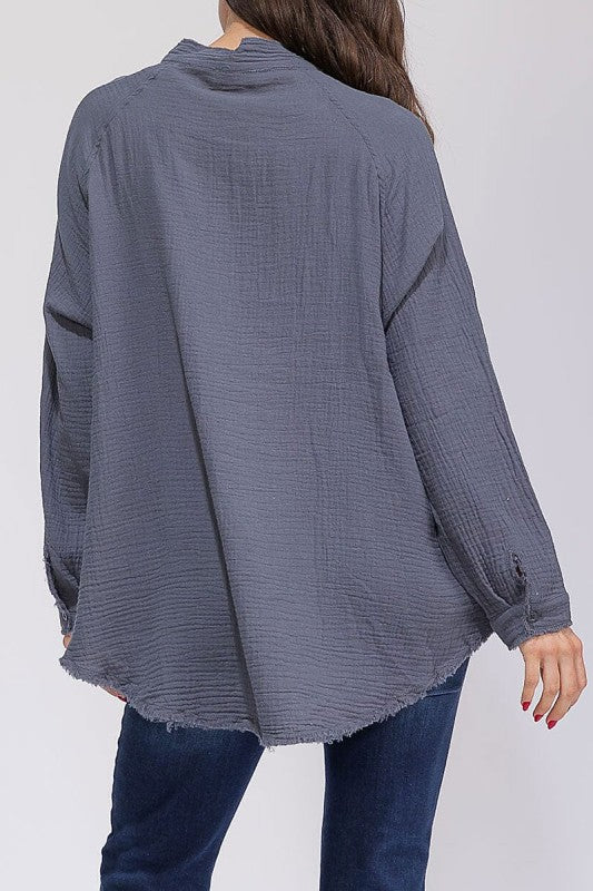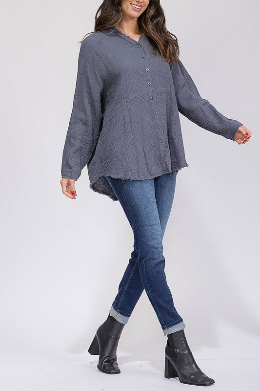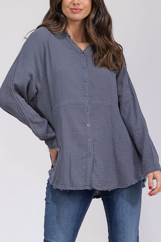 This waffle weave tunic brings cozy charm with its playful frayed hem and long sleeves. The button-down front adds a flirty touch while making layering a breeze. Perfectly paired with your favorite fall leggings, it’s the go-to for effortless comfort and style as the season turns crisp.