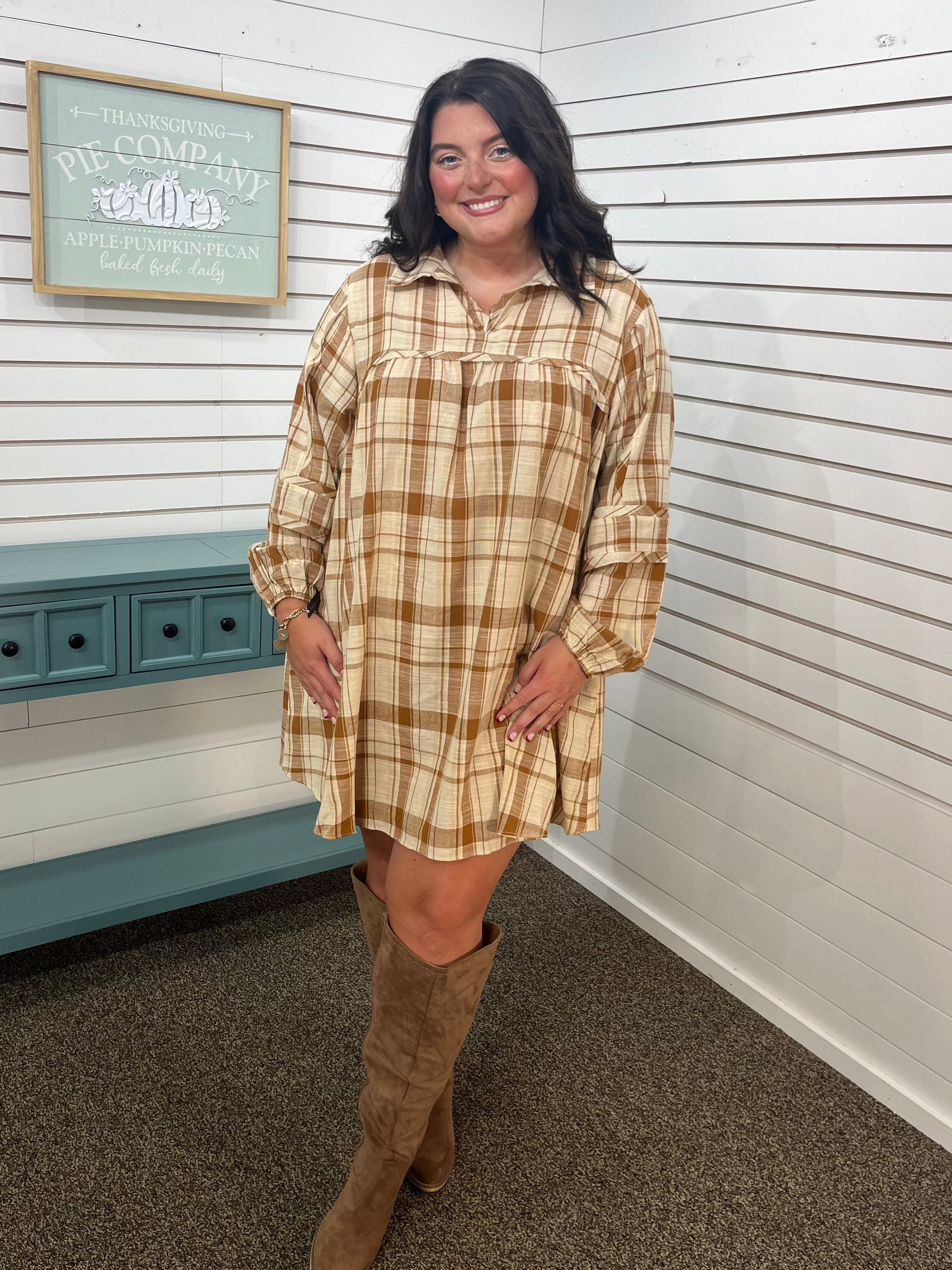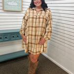 This playful babydoll mini dress features a charming brown plaid pattern and delicate puff sleeves that add a touch of whimsy. The frill detail along the hem brings a flirty flair, while convenient side pockets keep essentials close. Perfect for days when you want to feel effortlessly fun and stylish.