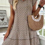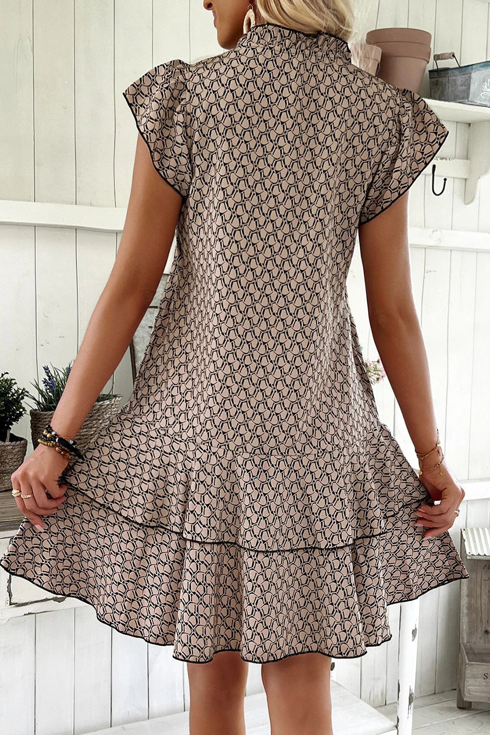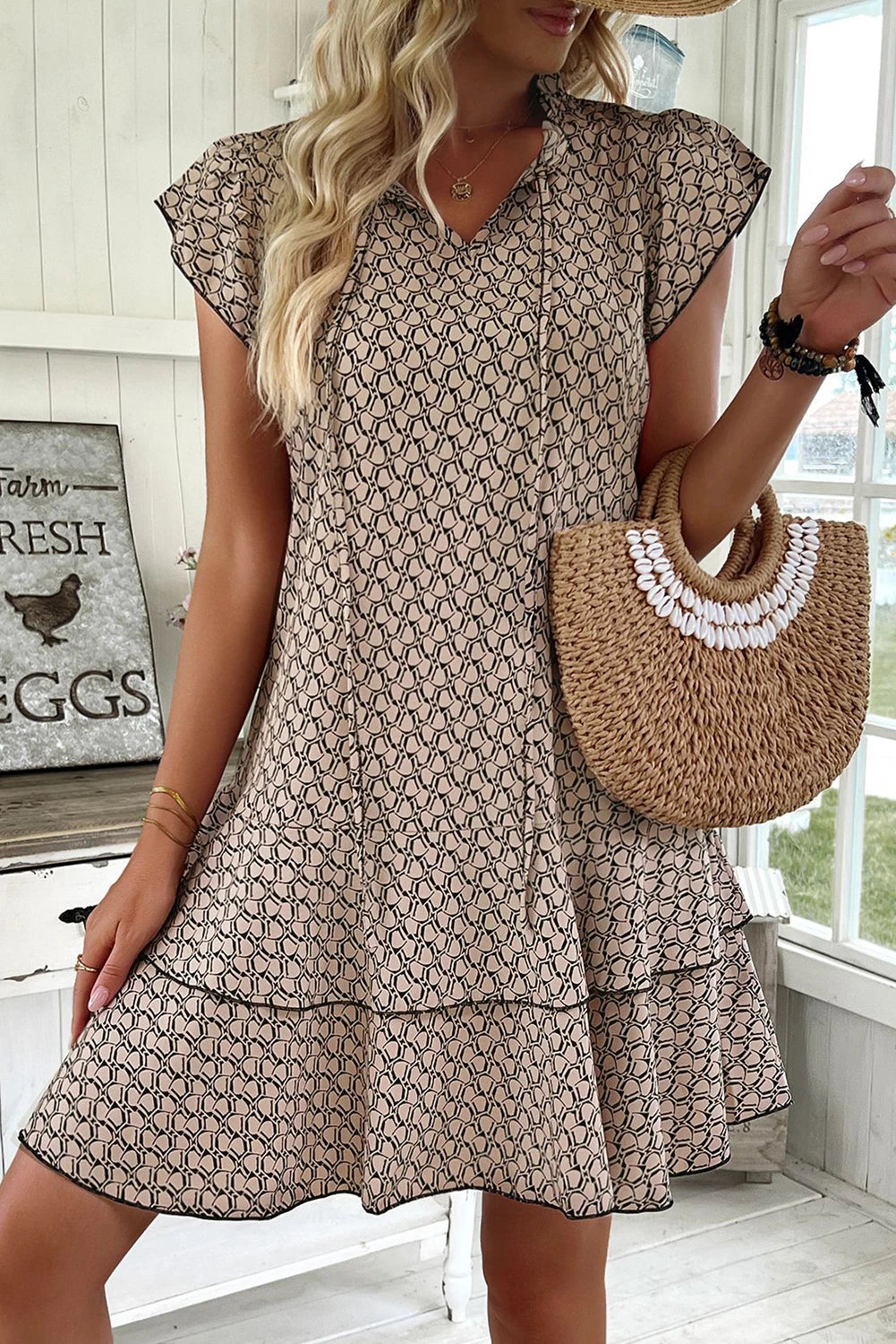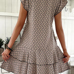 Embrace effortless charm with this playful khaki mini dress featuring an all-over print and flounce sleeves that add a fun, flirty touch. The ruffle detail and short sleeve V-neck design create a breezy, boho vibe perfect for sunny days and spontaneous adventures.