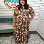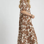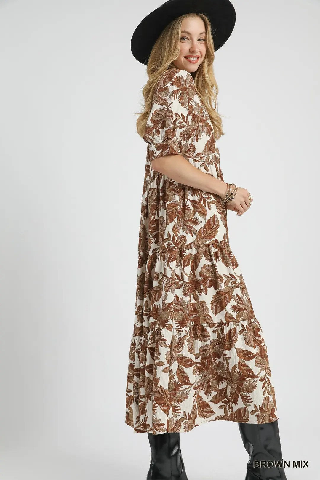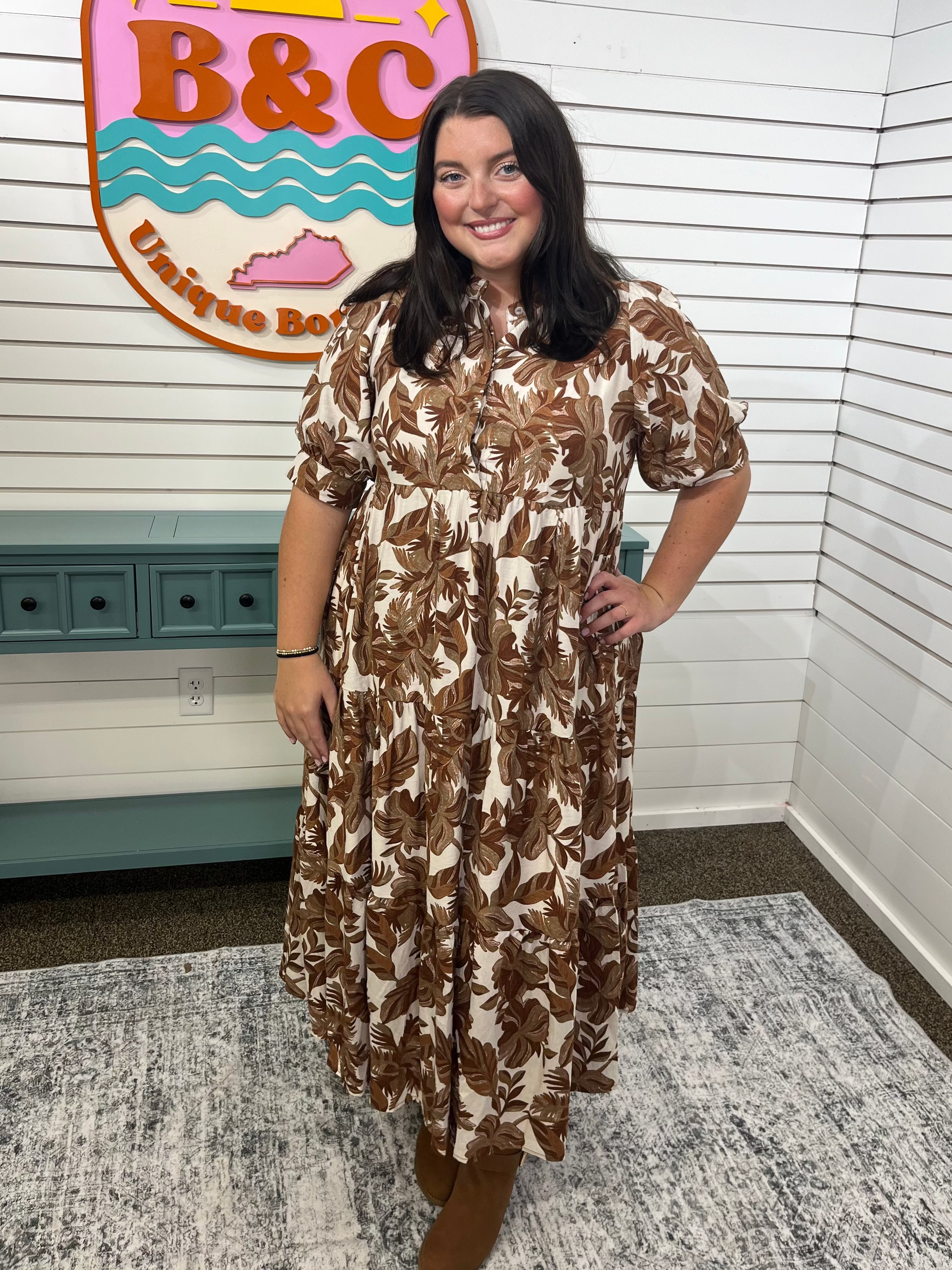 Step into effortless style with the Brie Looks Good in Boho dress. This tiered midi features a charming leaf print and a relaxed, flowy silhouette that twirls with every step. The round neck and hidden placket add subtle detail, while elbow-length puff sleeves bring a playful, breezy vibe. Perfect for sunny days, this unlined dress promises comfort and carefree boho flair wherever you go.