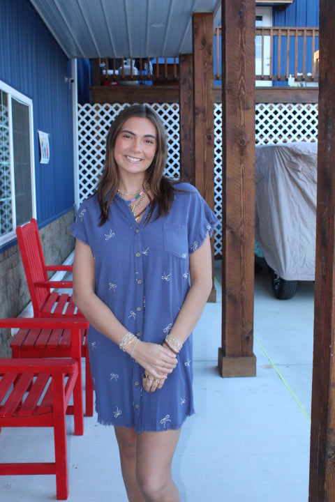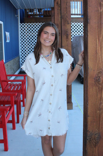 Meet your new favorite dressβa linen blend beauty that's as comfortable as it is charming. Adorned with delicate ribbon embroidery and playful bows, this shirt dress brings a touch of whimsy to your everyday wardrobe. The lightweight, breathable fabric makes it ideal for warm weather, while the relaxed fit ensures you'll reach for it again and again. Dress it down with sneakers or elevate it with heelsβeither way, you're guaranteed to turn heads with effortless style.
