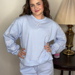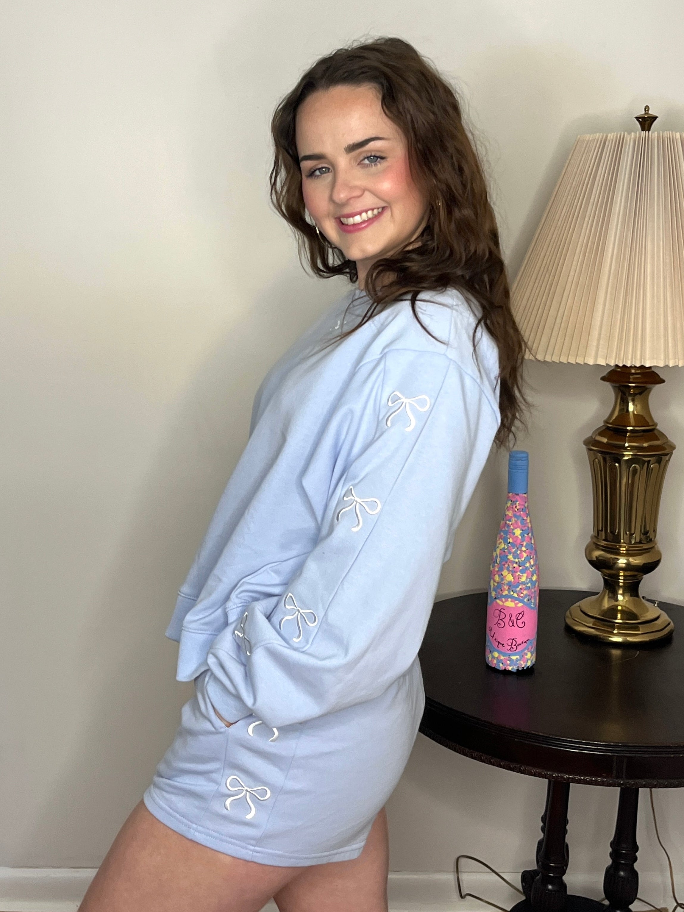 This playful long-sleeve crewneck top features charming ribbon bow embroidery on the center and sleeves, perfectly matched with coordinating shorts. Crafted from a soft blend of 50% cotton and 50% polyester in a light blue hue, this set offers comfort and style for relaxed days and fun adventures.