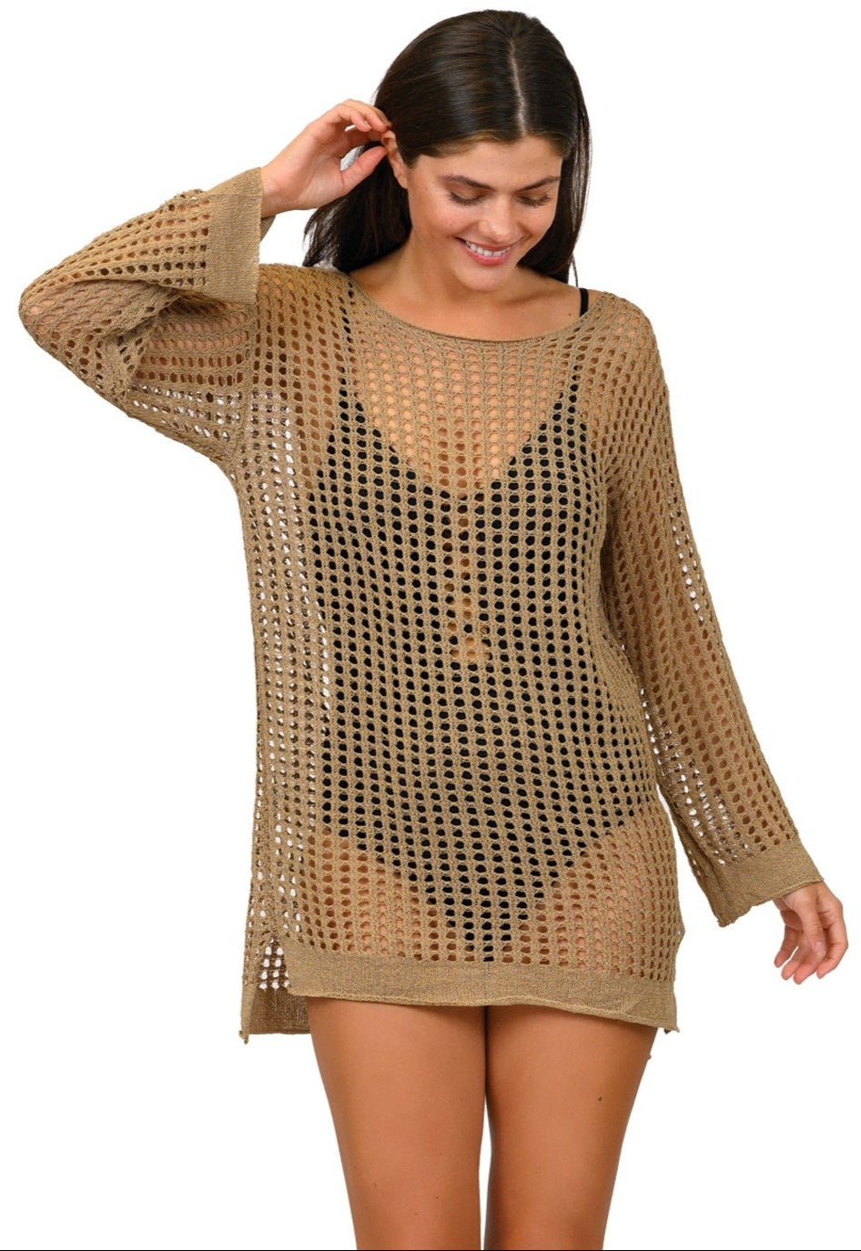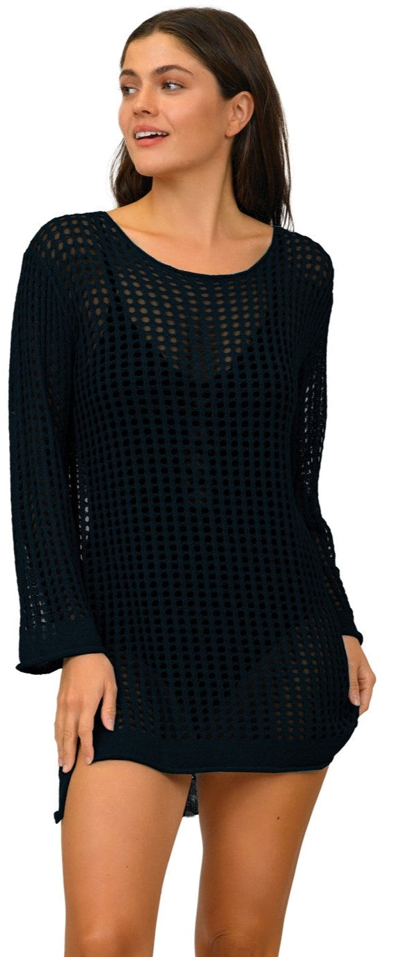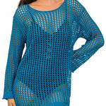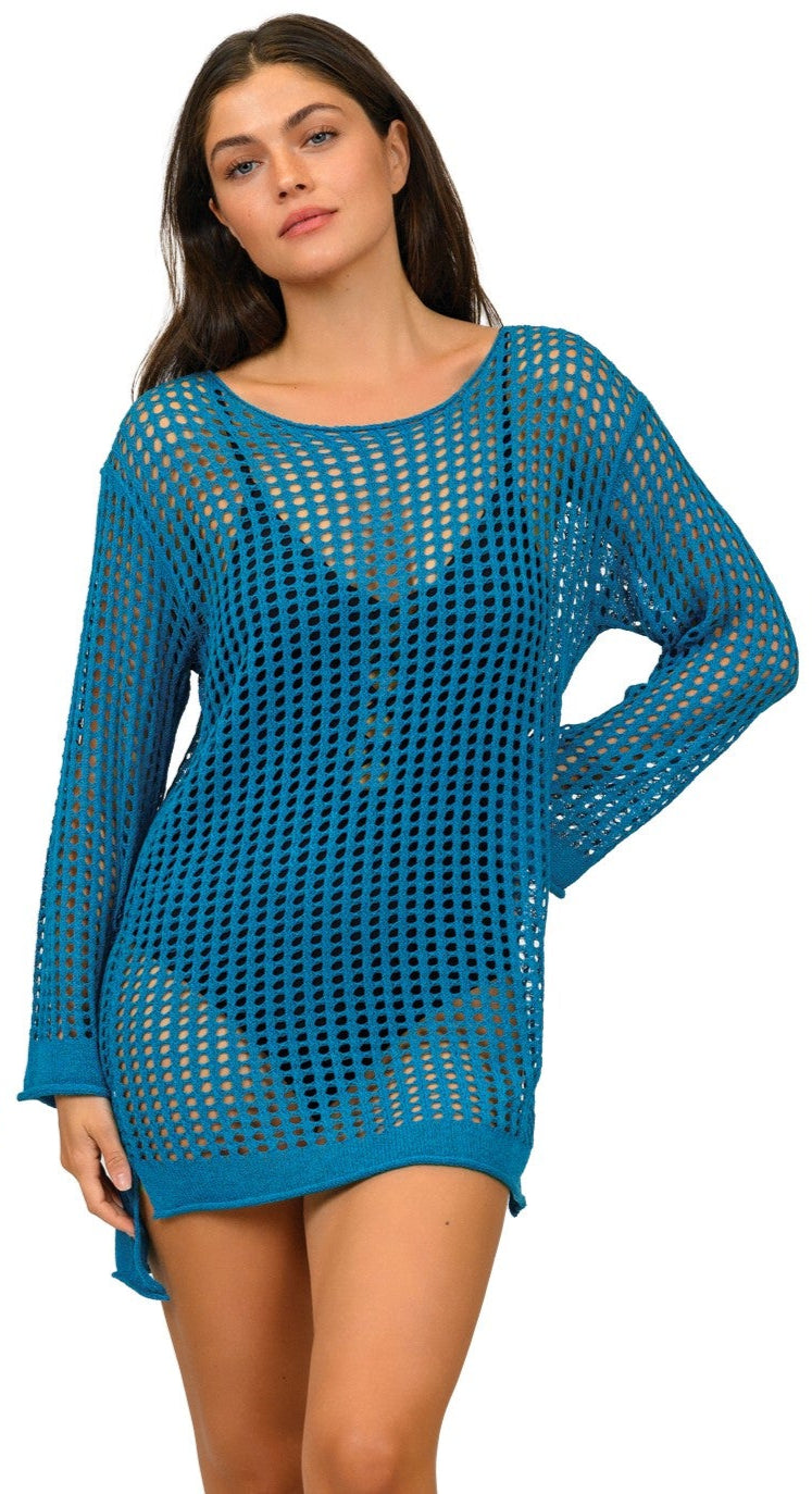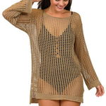 Make a splash at the beach in our crochet pullover coverup! Designed to fit most sizes, it boasts an airy open crochet pattern, cozy long sleeves, and a round neckline accented with solid cuffs and hem. It’s the perfect playful layer to keep you stylish, cool, and effortlessly covered over your swimwear.