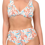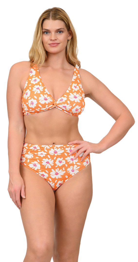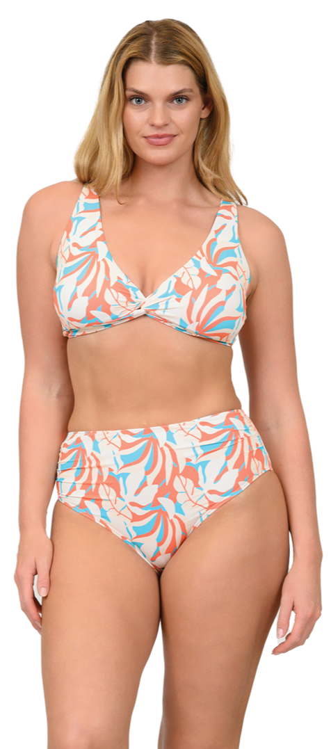 Enjoy sunny days in the Women’s Caribbean Sand swimsuit. This playful two-piece features an adjustable twist tie top with gold accents and ruched high-waisted bottoms for a flattering fit. Perfect for fun in the sun!