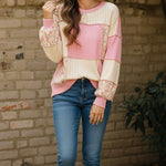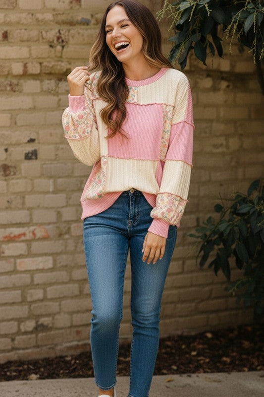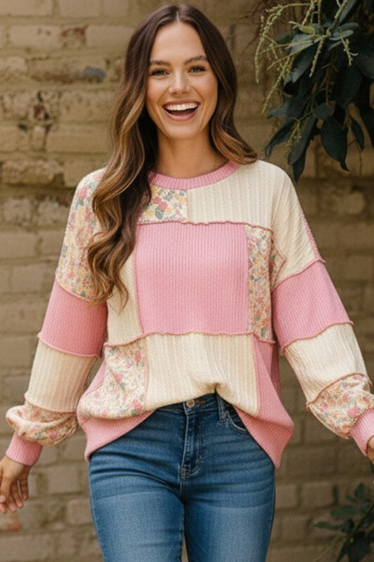 Charming floral print layered with color-block patchwork, it blends playful style with comfort. The soft French terry fabric hugs you in all the right ways, while the ribbed cable knit details and bubble long sleeves add texture and personality. Round neckline keeps things effortlessly casual. Perfect for weekend lounging or dressing up with your favorite jeans—this top brings joy to your everyday rotation.