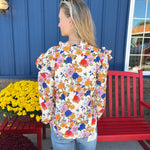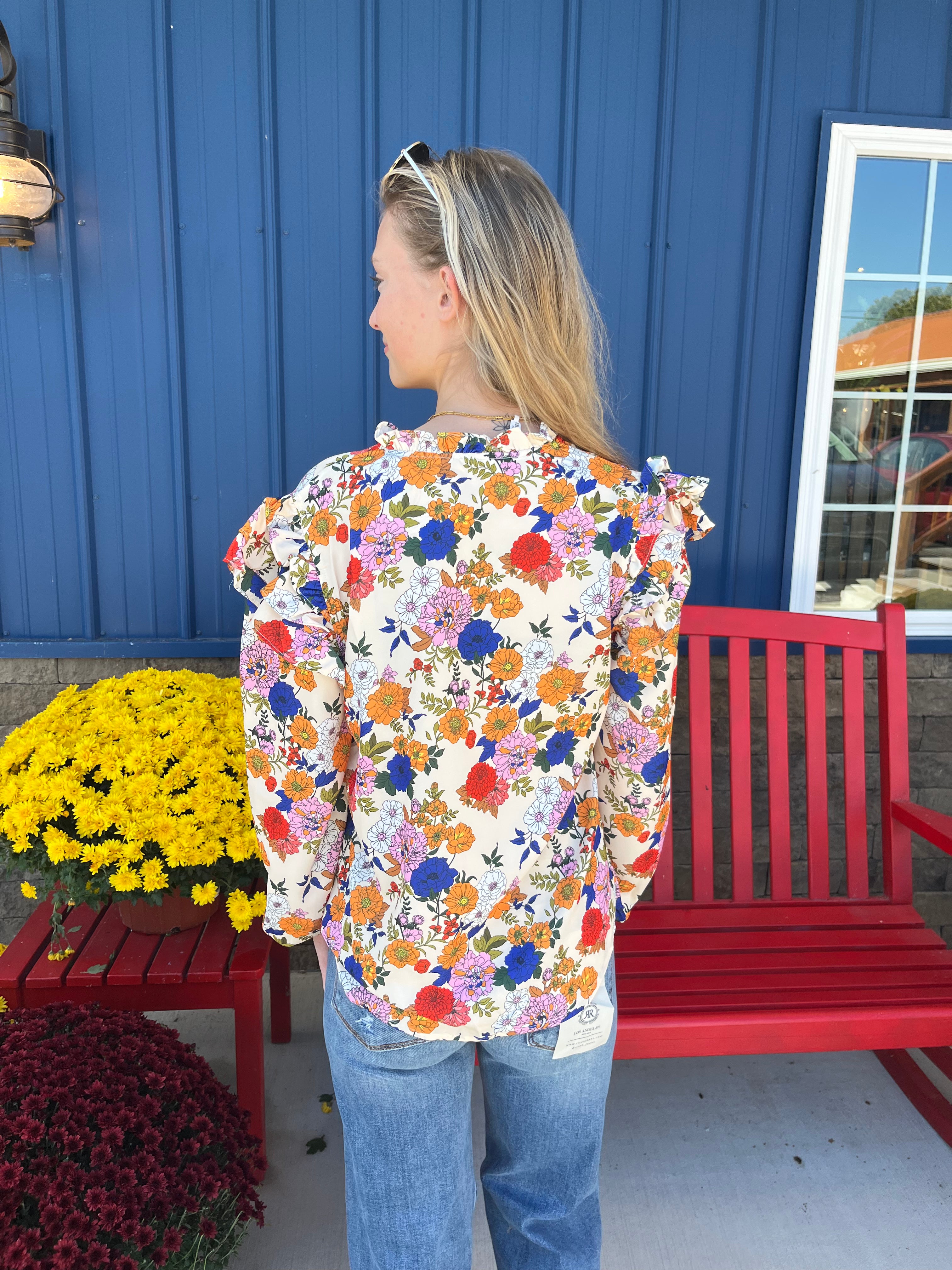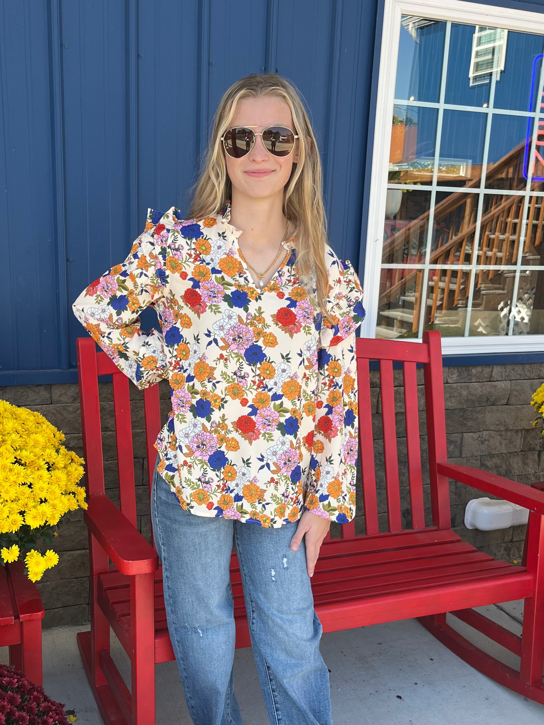 Bring fresh charm to your wardrobe with this apricot long sleeve floral blouse. Featuring a playful v-neck and delicate ruffle detailing, it adds a flirty touch to any look. The soft, breathable fabric ensures all-day comfort, while the puff sleeves add a whimsical, vintage-inspired flair. Perfect for brightening up your day with effortless style!