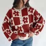 Brighten your wardrobe with this charming Red Flower Colorblock Sweater, where whimsical blooms seem to dance across the front in a delightful checkers pattern. The button-front design offers easy layering, while the bishop sleeves add a touch of vintage-inspired elegance with modern flair. Perfect for those who love mixing playful prints with timeless style, this sweater brings joy to everyday wear.
