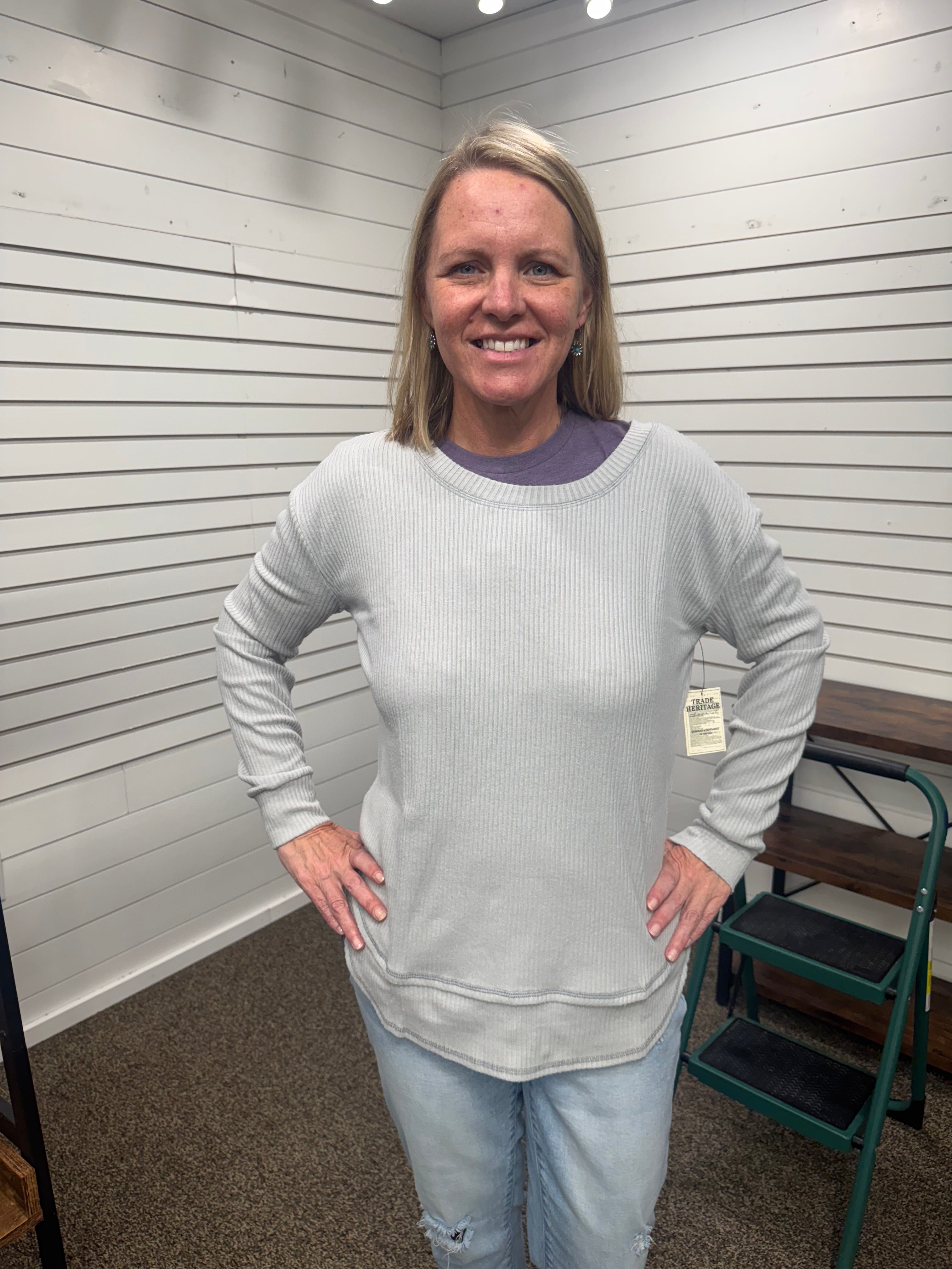 Experience comfort with our Soft Rib Crewneck, tailored for a relaxed, roomy fit and long sleeves ideal for layering. Crafted from soft rib fabric, it features an elegant rounded hem, available in natural or grey hues. This crewneck effortlessly elevates your daily wardrobe, offering both ease and subtle sophistication — perfect for lounging or casual occasions.