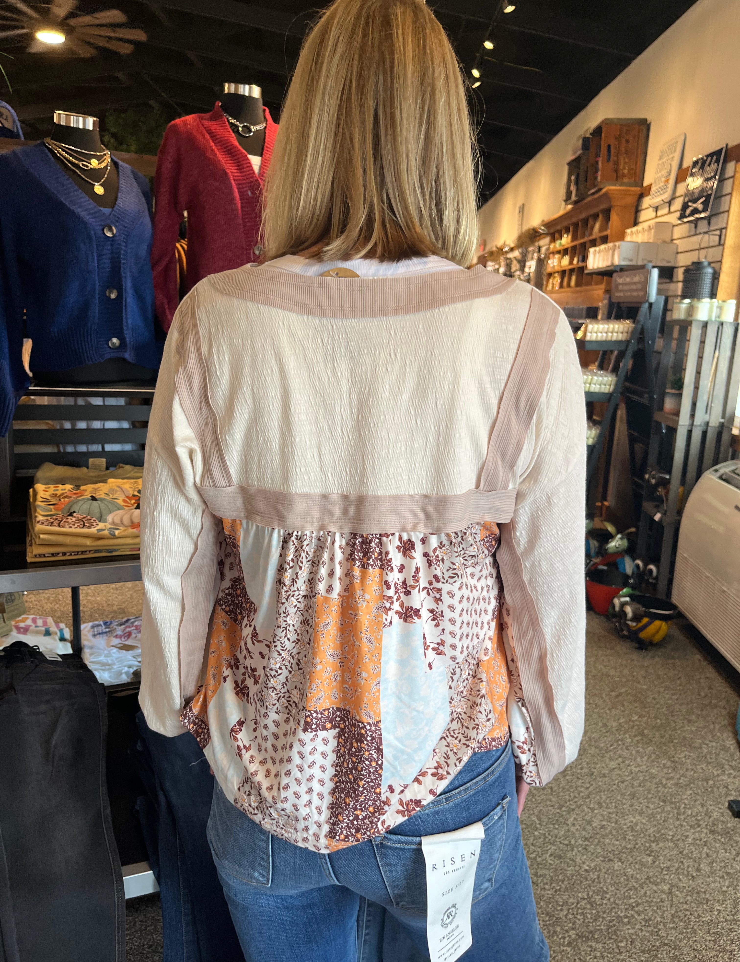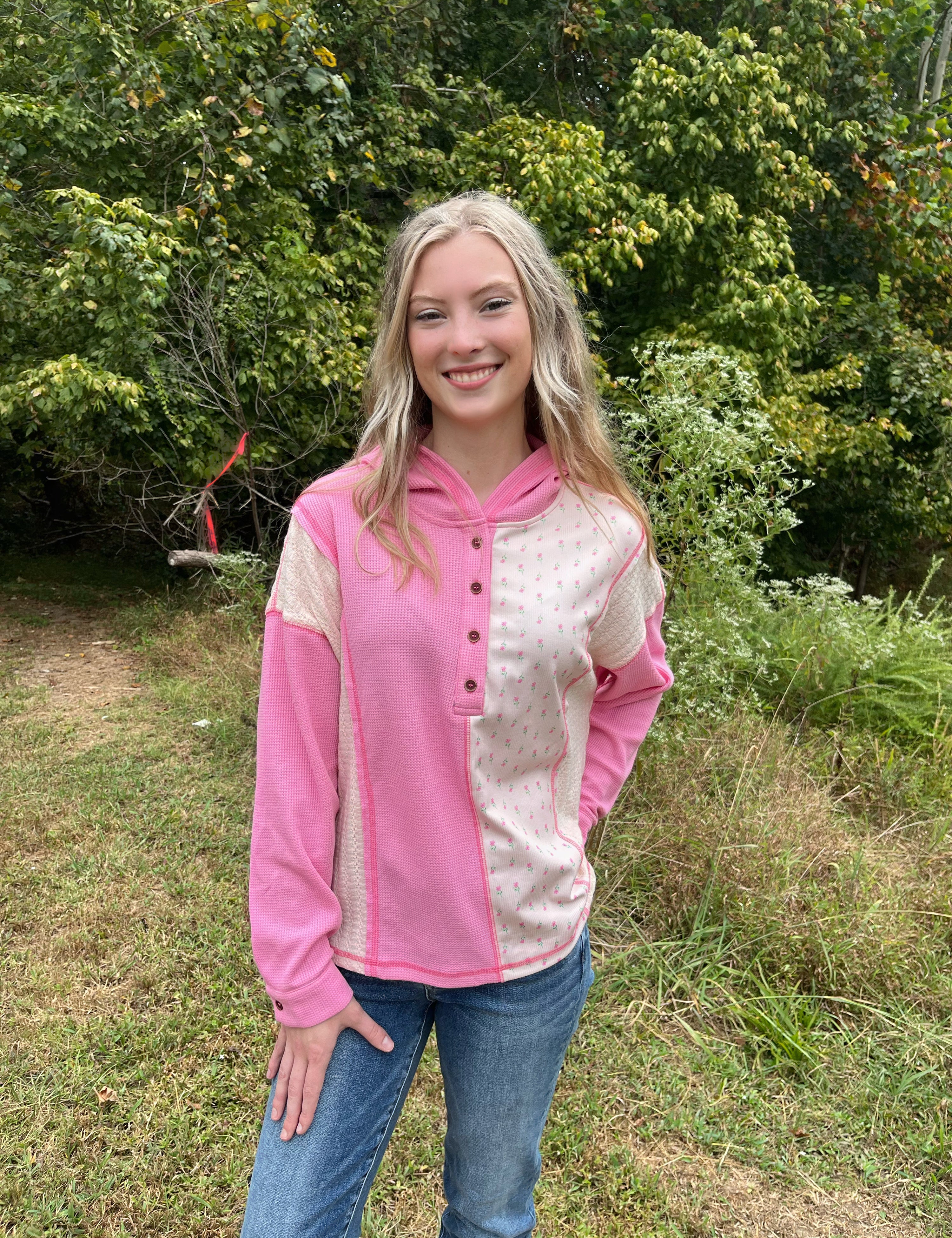 Waffle Floral Patchwork Hooded Oversize Pullover