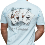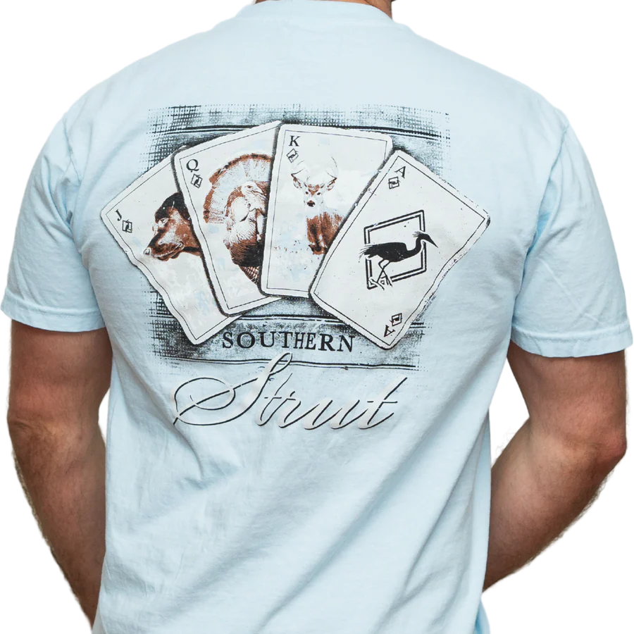 Elevate your game with southern strut hunting cards! Featuring a unique hand of hunting cards graphic on the back, these comfort color brand tees will keep you comfortable and stylish on and off the field. A must-have for any hunting enthusiast.