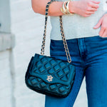 The Elle Crossbody Black DQ blends sophisticated style with practical design. Made from soft quilted faux lambskin in a chic spotted diamond pattern, this fold over bag brings elegance to any ensemble. Its adjustable woven chain strap offers versatile wear options, while the classic logo detail lends a refined finish. Compact yet roomy, it measures 9" by 7" with a 3" thickness and features a 26" single strap drop or a 16" doubled strap drop, perfect for seamless transitions from day to night.