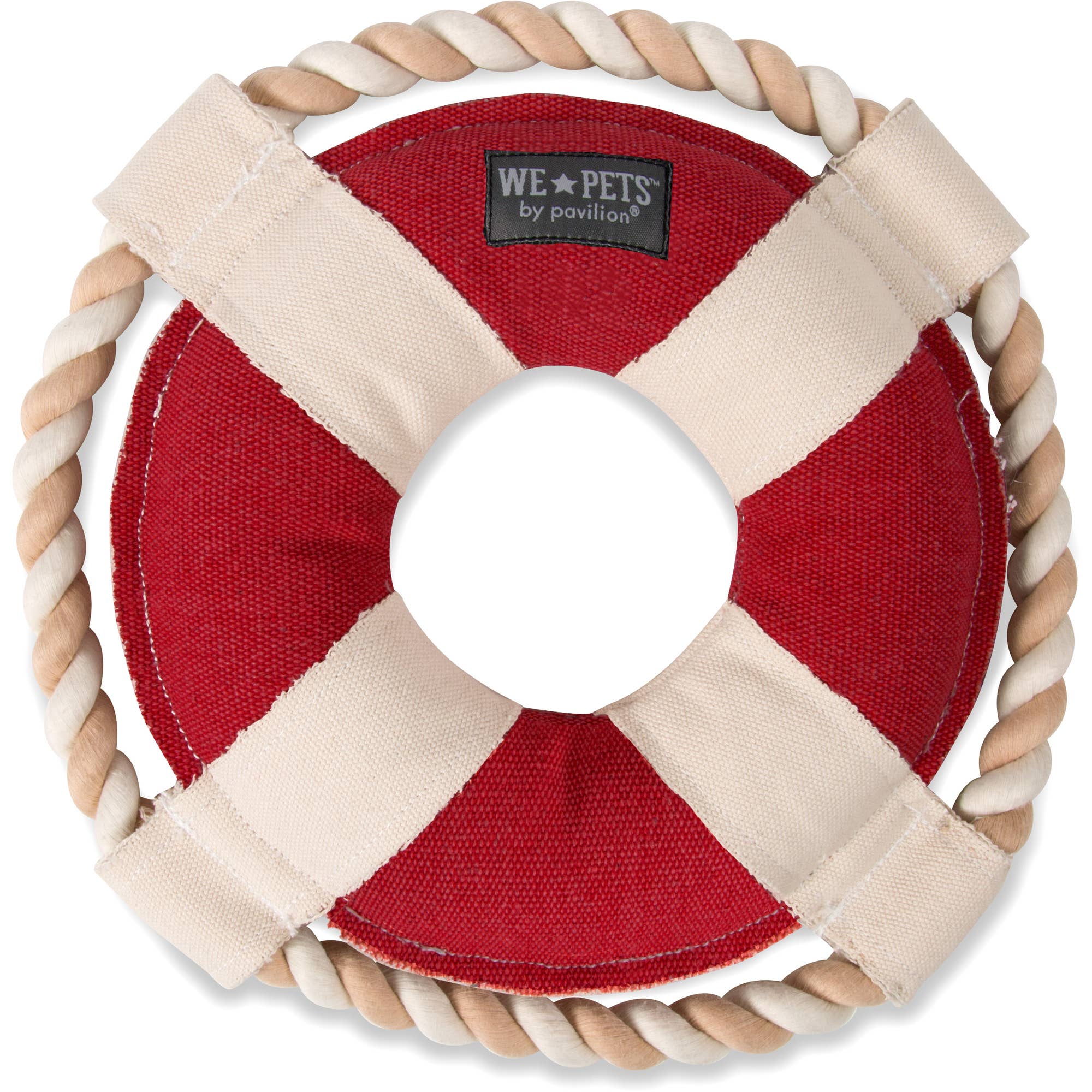 This liferaft-shaped dog toy is made from a durable cotton-poly blend with a soft poly-fill inside and a fun squeaker. It features "best rescue ever" text and a rescue logo on the front, perfect for your playful rescue dog. Easy to clean by hand and dry in the sun.
