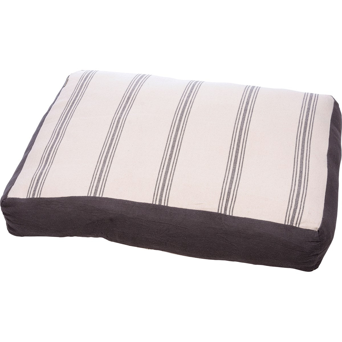 A small double-sided cotton dog bed featuring gray striped design and gusset in coordinating color. polyester filling. features zipper to easily remove and clean cover. machine-washable.