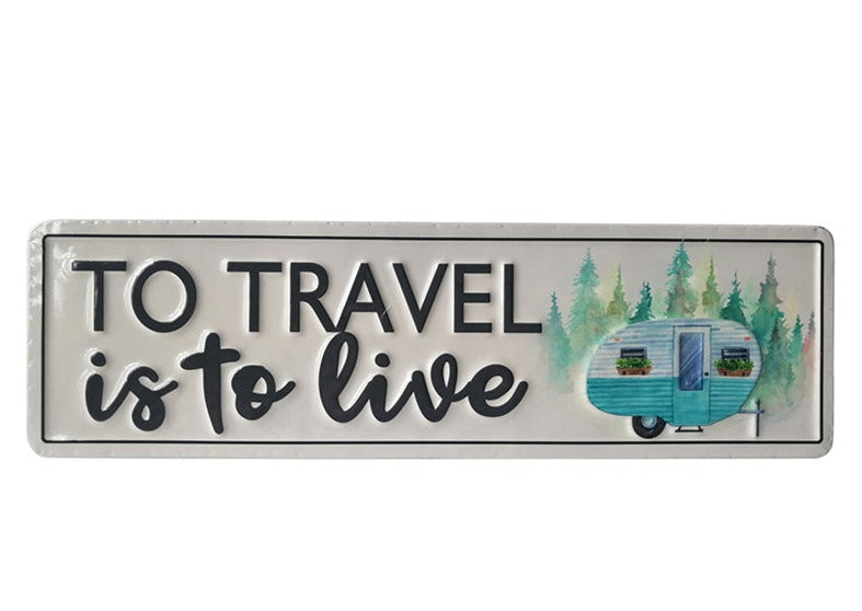 The "Travel To Live" sign measures 24" by 0.7" and is crafted from sturdy metal.