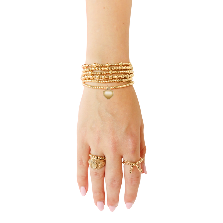 Slip on elegance with our 3MM gold beaded stretch bracelet, featuring an adorable heart locket charm that keeps your treasures close. Crafted from 14K gold-filled beads, this beauty is built for real life—sweat-proof, water-proof, and tarnish-free, so you can wear it every single day without worry. Whether you're hitting the gym, catching waves, or just living your best life, this bracelet stays as radiant as you do. The stretchy design means no fussing with clasps, just slip it on and go!