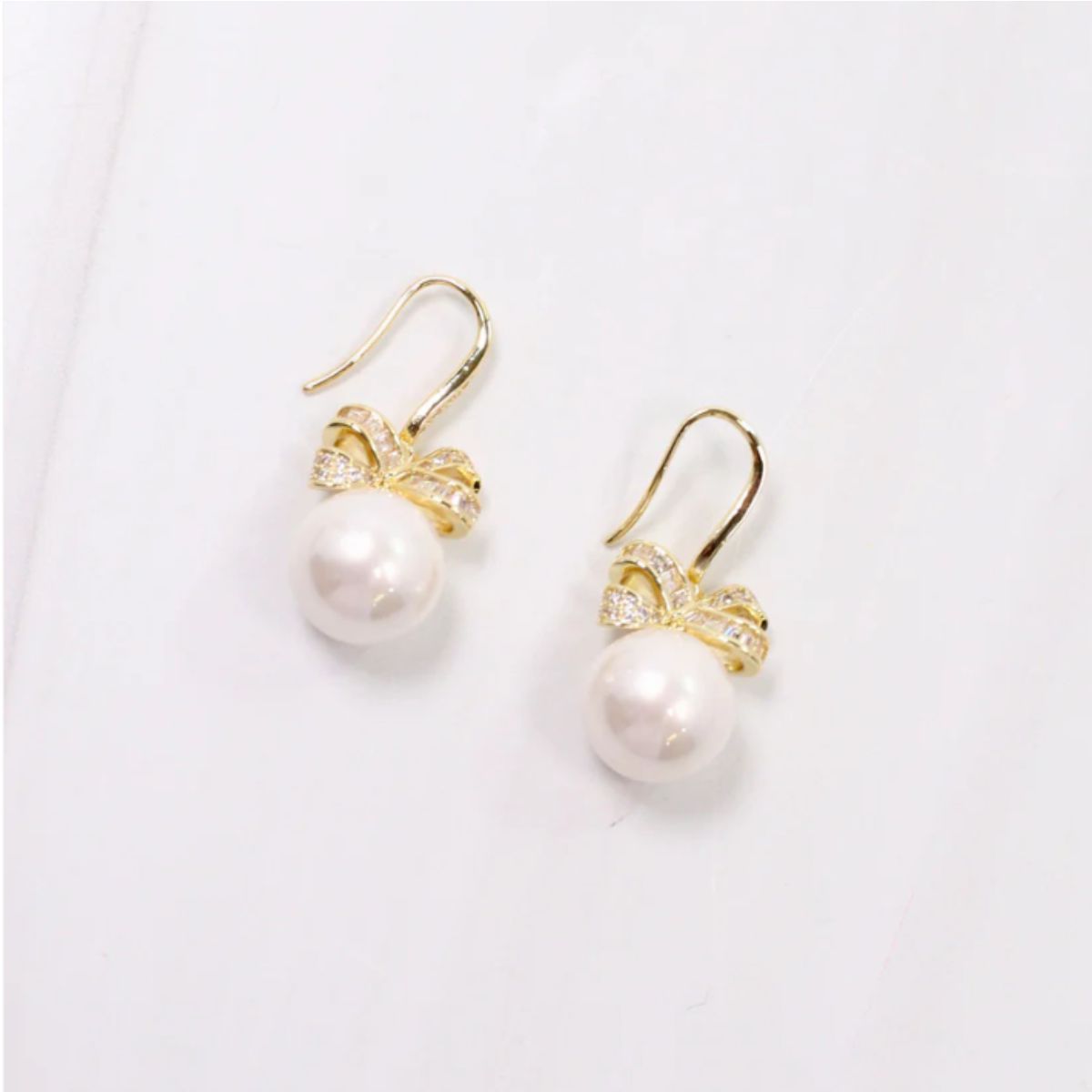The Kensington Pearl Earring in gold features a sparkling cubic zirconia bow elegantly suspending a lustrous pearl, offering timeless sophistication. Its gold-dipped fish hook provides comfortable wear while enhancing the earring’s luxurious appeal. At 1.25 inches long, this piece is a graceful addition to elevate any refined outfit.
