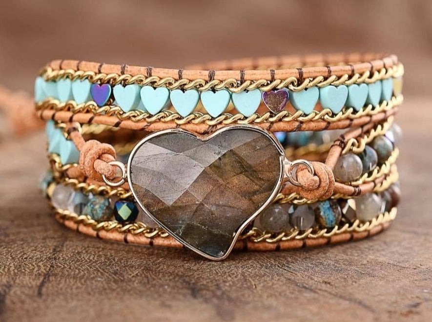 This handcrafted wrap bracelet combines natural labradorite and mixed beads on genuine leather. Measuring approximately 33.5 inches, it features three adjustable closures for a perfect fit.