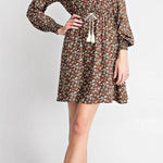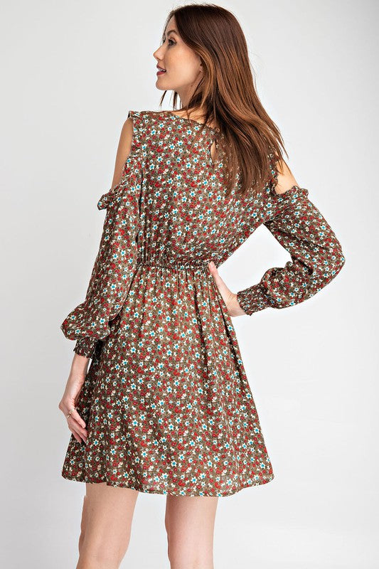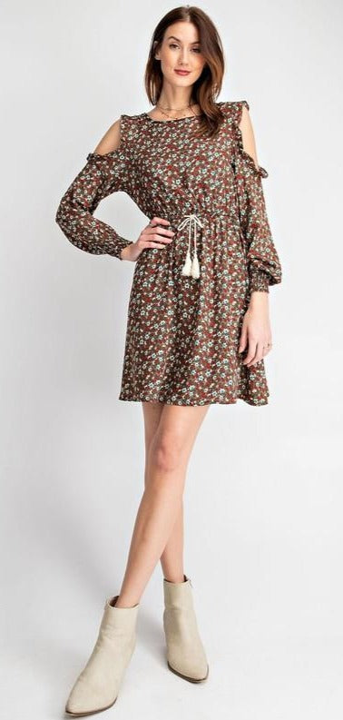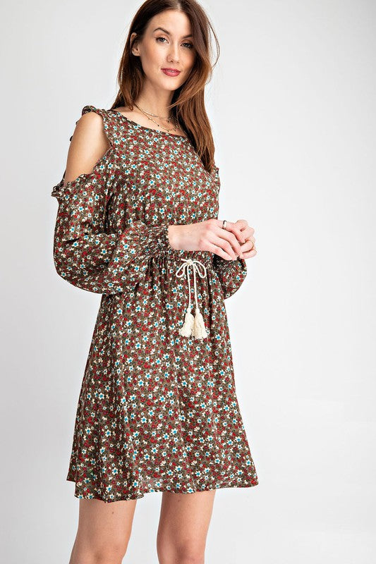 Vintage inspired cold shoulder long puff cuffed sleeve dress with cinched tied waist.