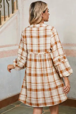 This playful babydoll mini dress features a charming brown plaid pattern and delicate puff sleeves that add a touch of whimsy. The frill detail along the hem brings a flirty flair, while convenient side pockets keep essentials close. Perfect for days when you want to feel effortlessly fun and stylish.