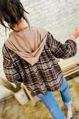 Cozy up your wardrobe with this playful brown plaid waffle knit henley top. Its loose fit and henley neckline offer easy comfort, while the contrasting hood and cuffs add a fun twist. Perfect for crisp fall days, this top invites you to layer up and enjoy the season in style.