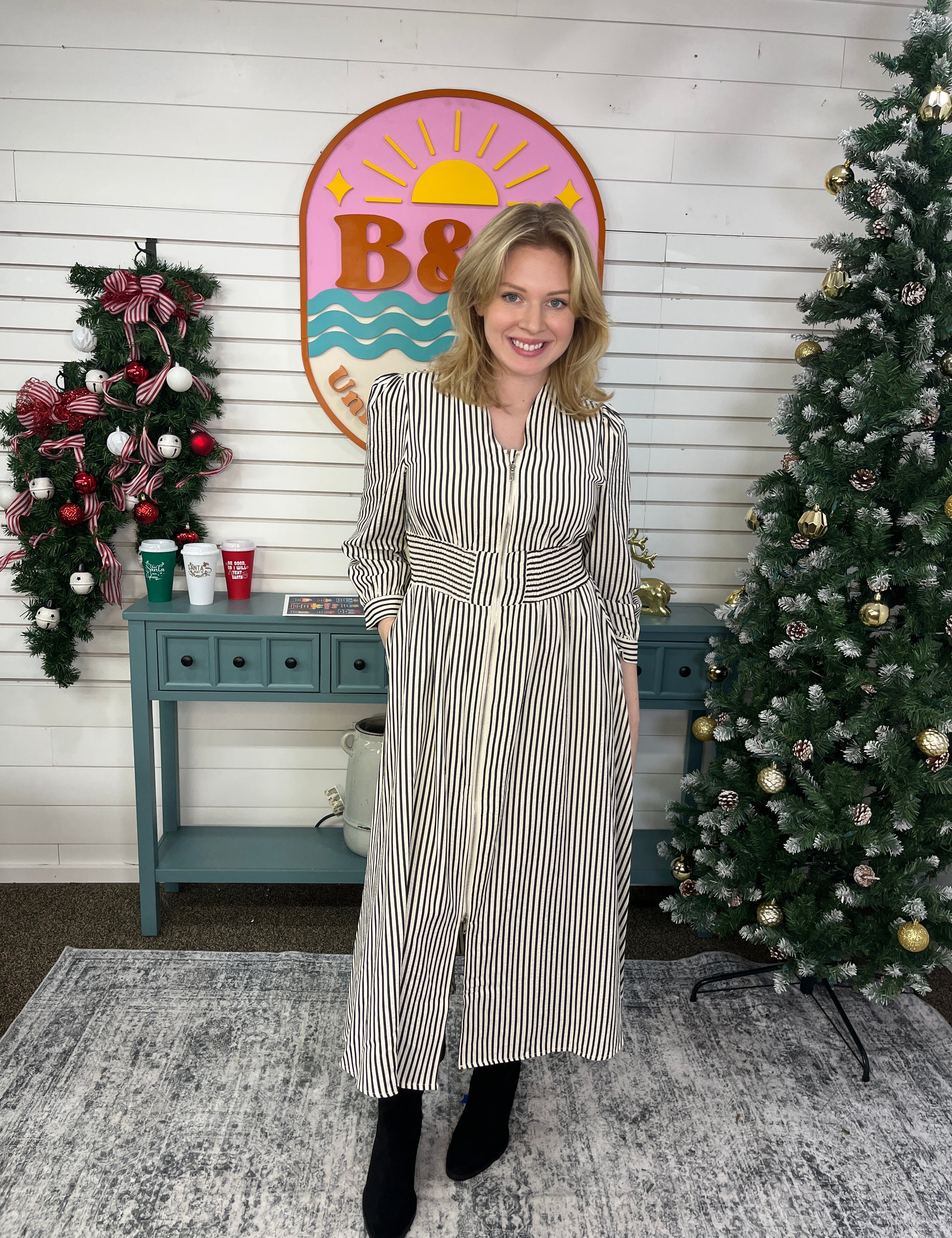 Cinched High Waist Stripe Midi Dress