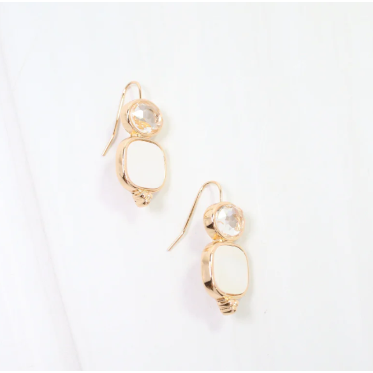 The Bloomington Drop Earrings feature radiant mother-of-pearl stones accentuated by sparkling CZ stones above, combining timeless elegance with refined sparkle. A sophisticated choice to enhance any ensemble.