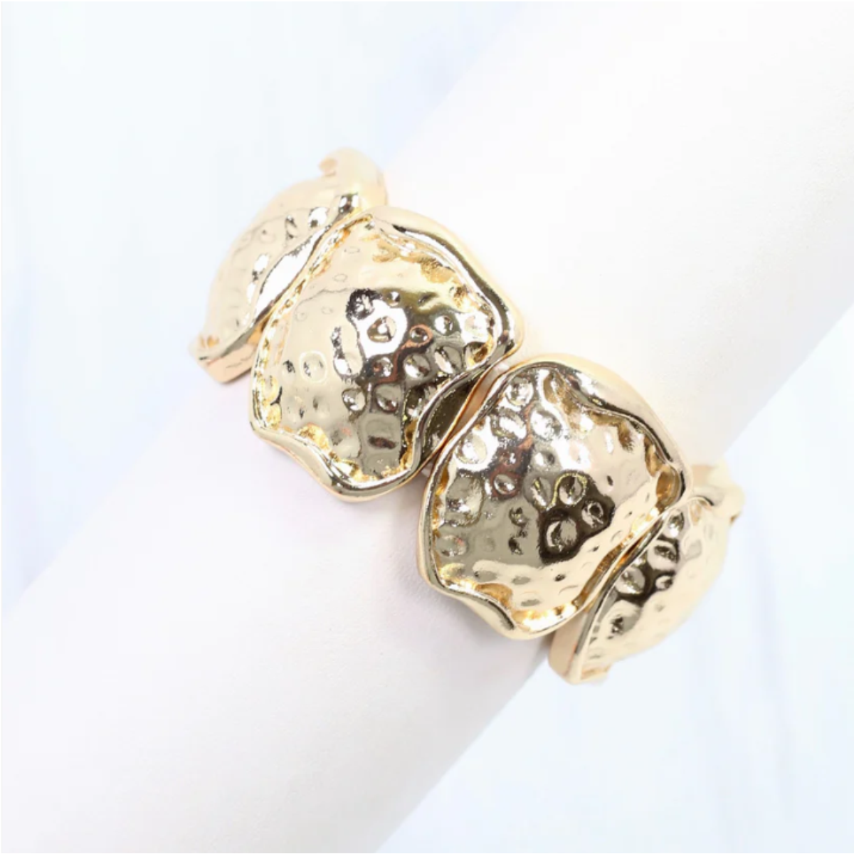 The Charlie Stretch Bracelet in Gold features a hammered shiny finish that combines classy elegance with an edgy touch. Its stretch design offers a comfortable, stylish fit for any occasion.