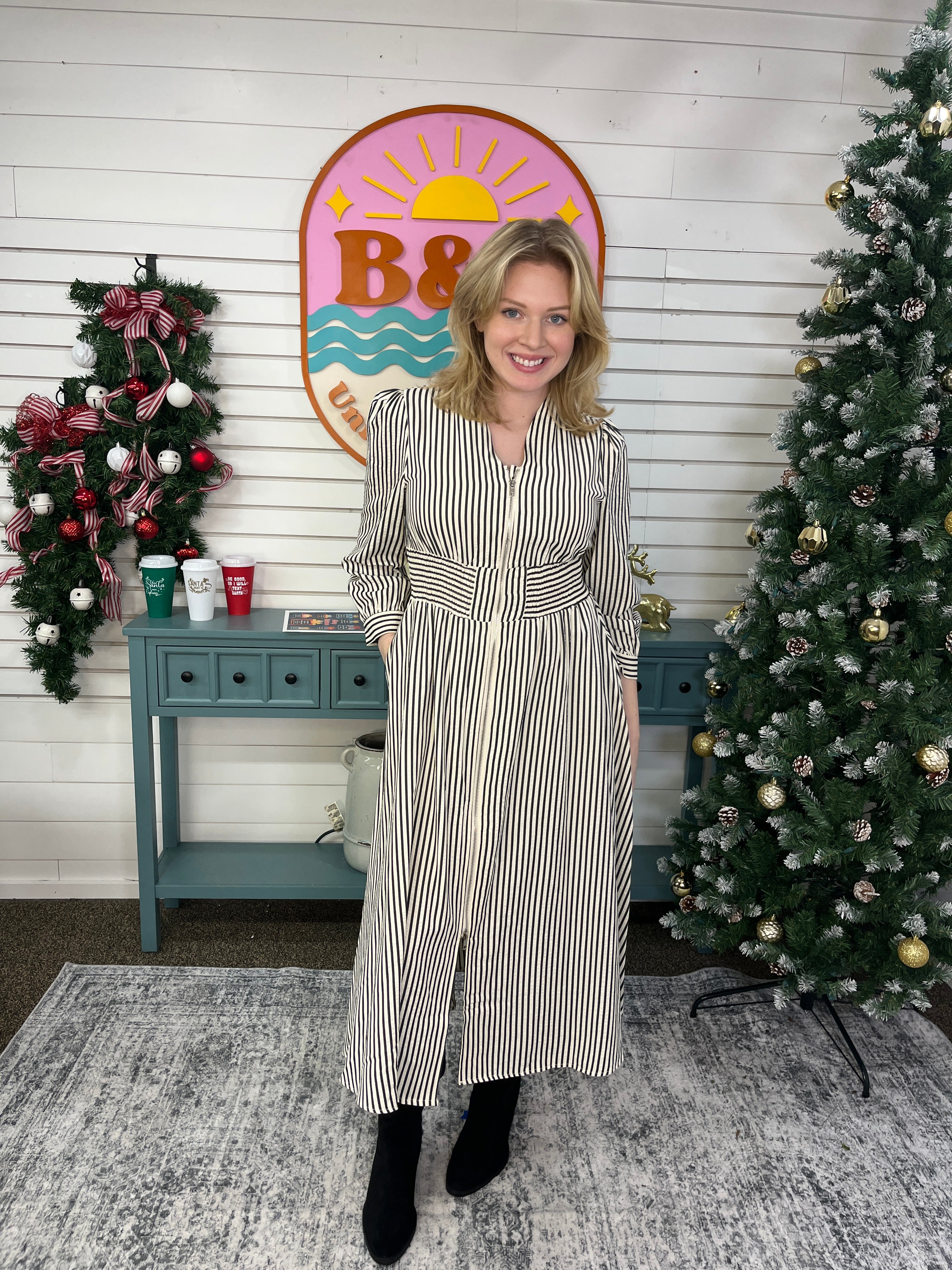 Meet your new go-to dress—a striped stunner that does it all. The high-waisted cinch flatters your figure while the full front zipper means zero wrestling with fabric. Black stripes keep things classic and cool, and yes, there are actual pockets because we know you appreciate the little things. Throw it on for brunch, the office, or anywhere in between. This dress gets it.