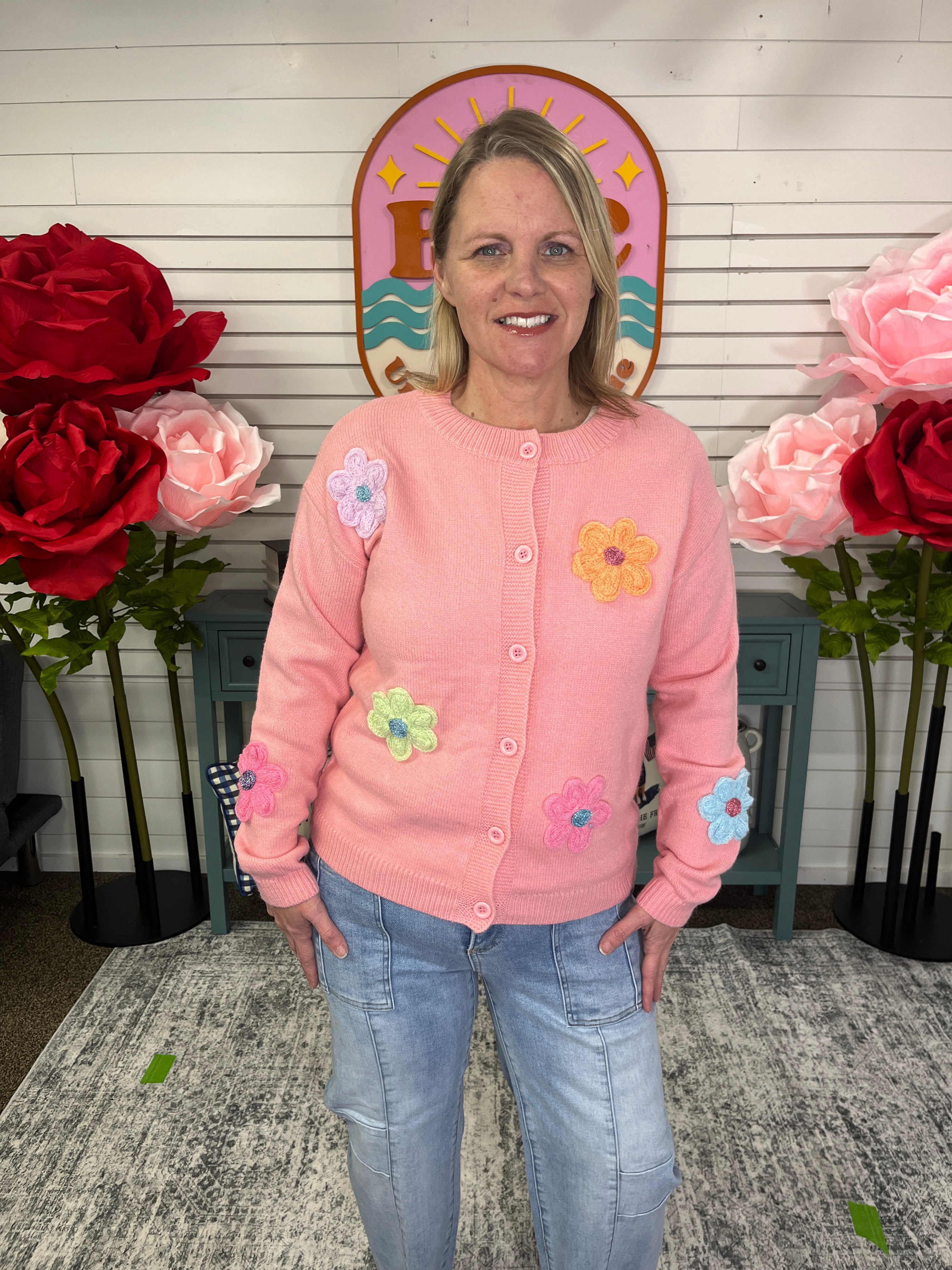 Bloom into style with this charming pink cardigan that's anything but ordinary. Featuring delicate knit applique flowers that pop right off the fabric, this button-down sweater adds instant personality to any outfit. The raised floral details catch the light beautifully, making it a conversation starter whether you're layering over a tee or wearing it solo. Soft, cozy, and undeniably cute—this is the cardigan that makes getting dressed feel like a little celebration.