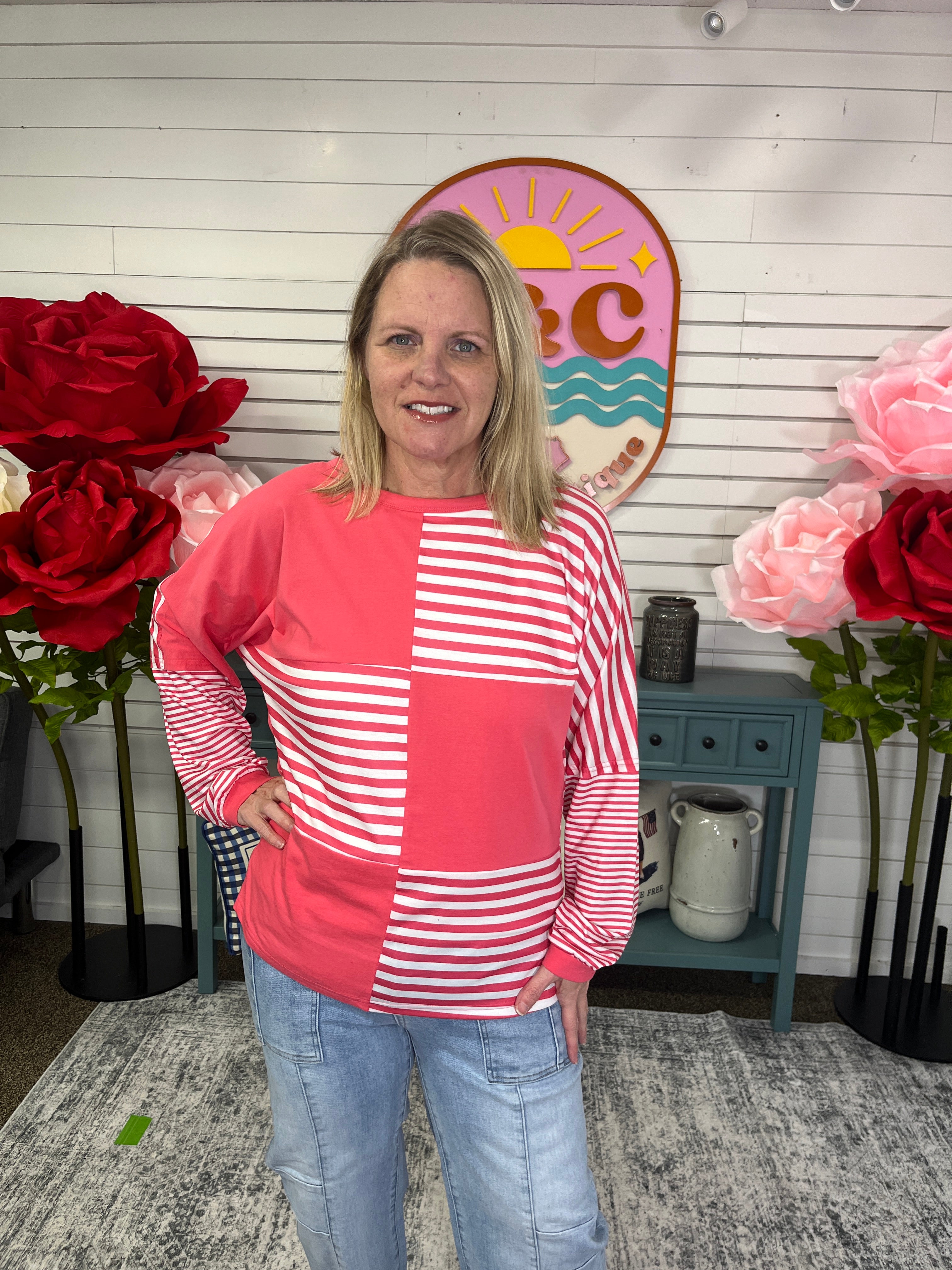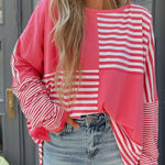 Mixing stripes with color blocks has never been this fun! This long sleeve top brings together bold patchwork panels in a playful design that's perfect for adding personality to your everyday wardrobe. The soft fabric drapes beautifully while the mixed pattern keeps things visually interesting. Whether you're layering it or wearing it solo, this piece strikes the perfect balance between statement-making and effortlessly wearable. A versatile essential that proves fashion doesn't have to be boring.