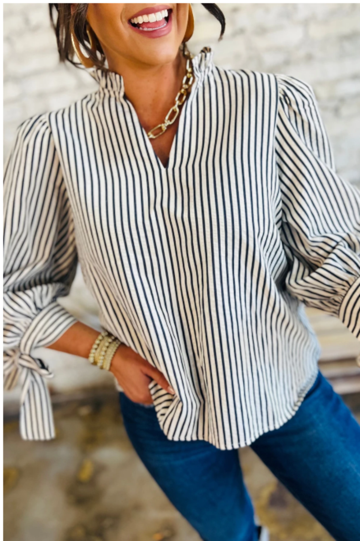 Make a statement with this delightfully fun striped blouse that's anything but ordinary. The frilled V neckline draws the eye while the adjustable open tie knot lets you control the vibe—cinch it tight for drama or leave it loose for effortless charm. Three-quarter sleeves provide the perfect sweet spot between coverage and breathability, making this your go-to piece for mixing sophistication with a dash of playful flair.