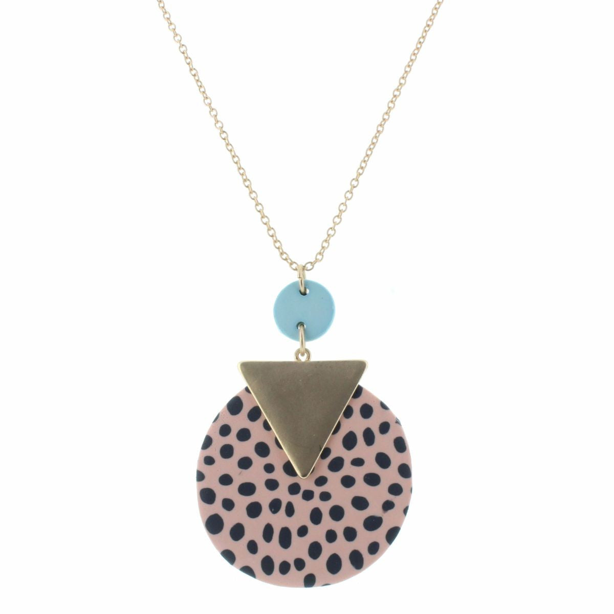Bright polymer clay circles in blue and peach, decorated with dots and highlighted by a charming gold triangle, hang from a 30" chain with an added 3" extender for extra fun and versatility.