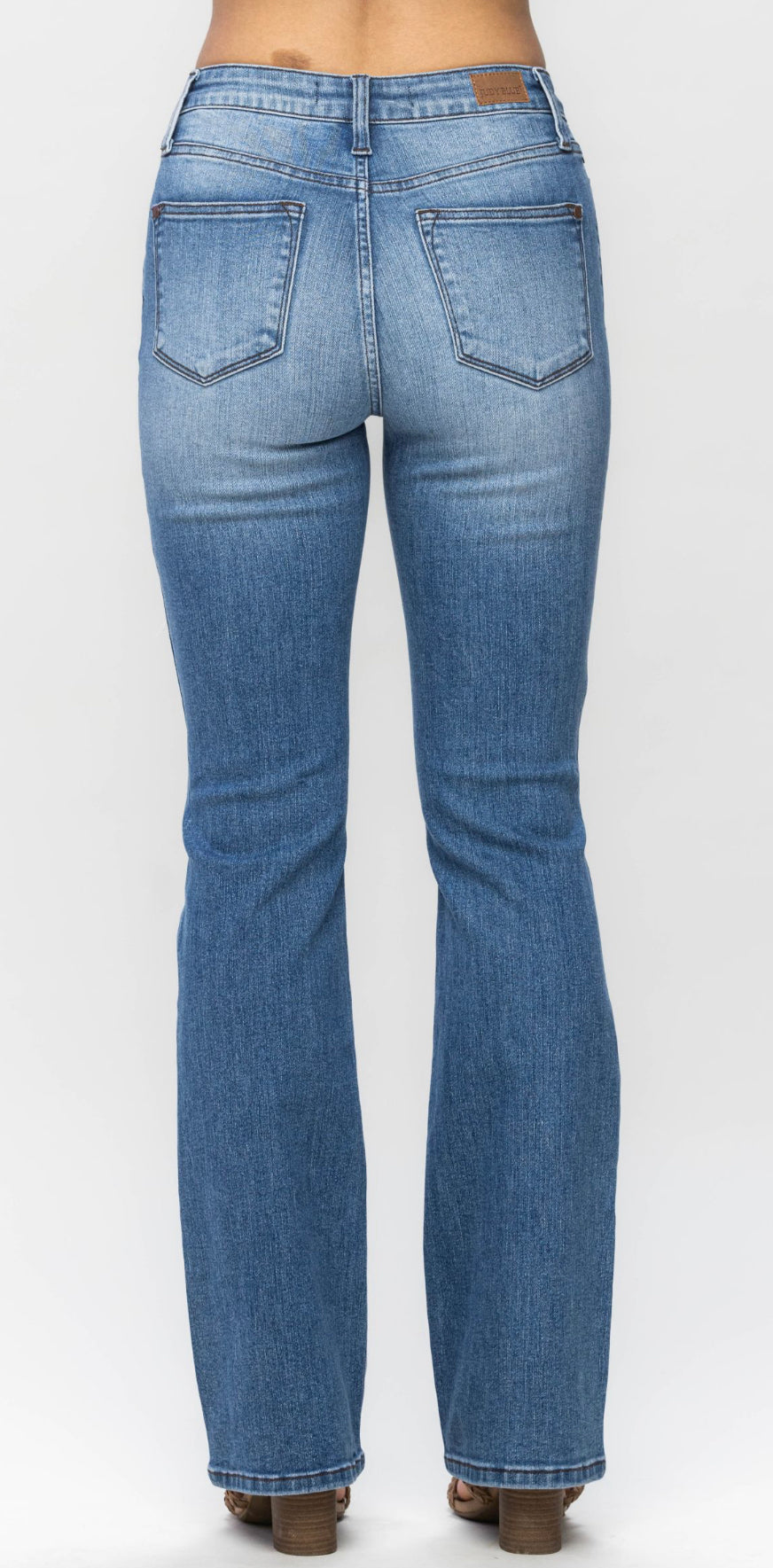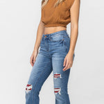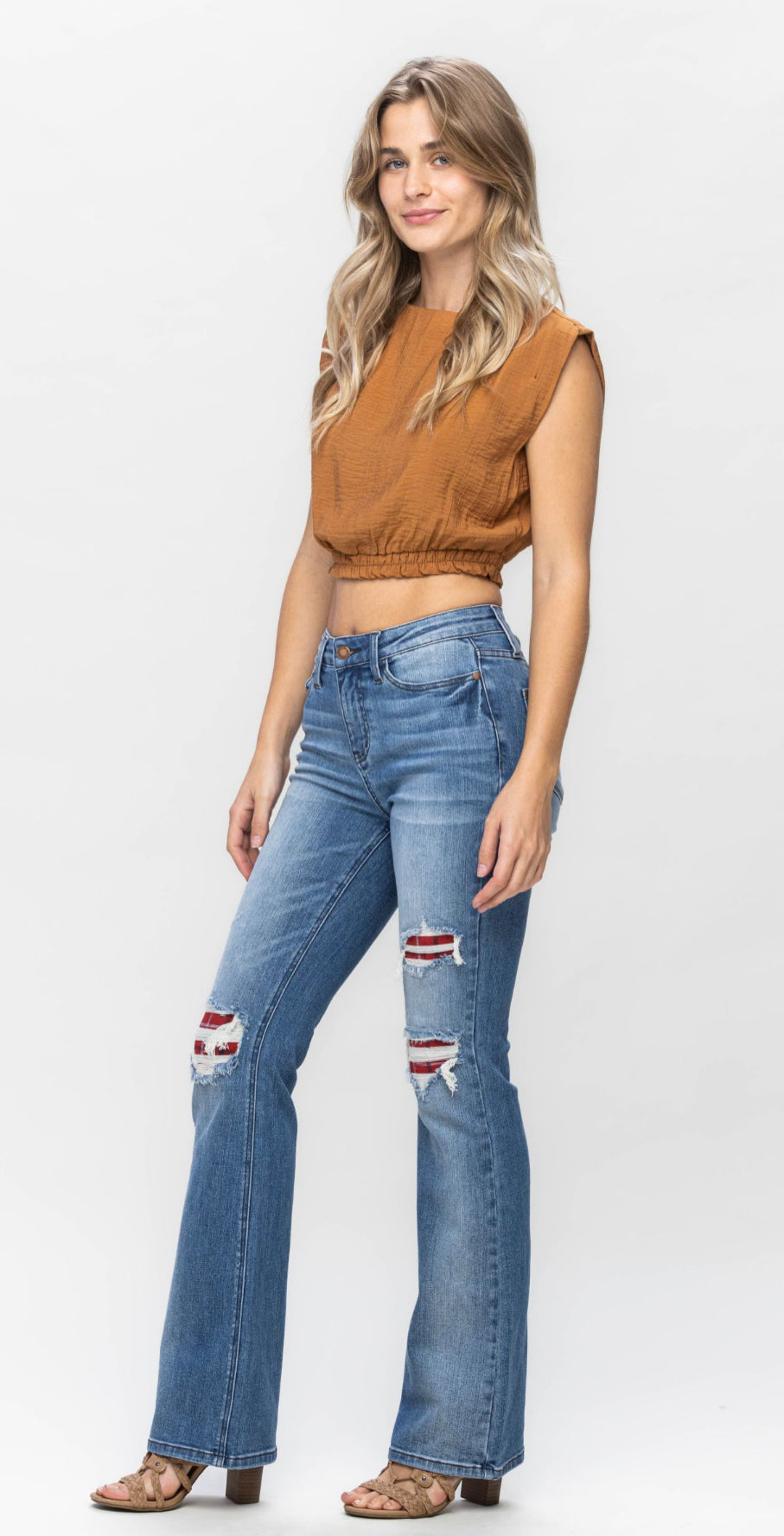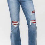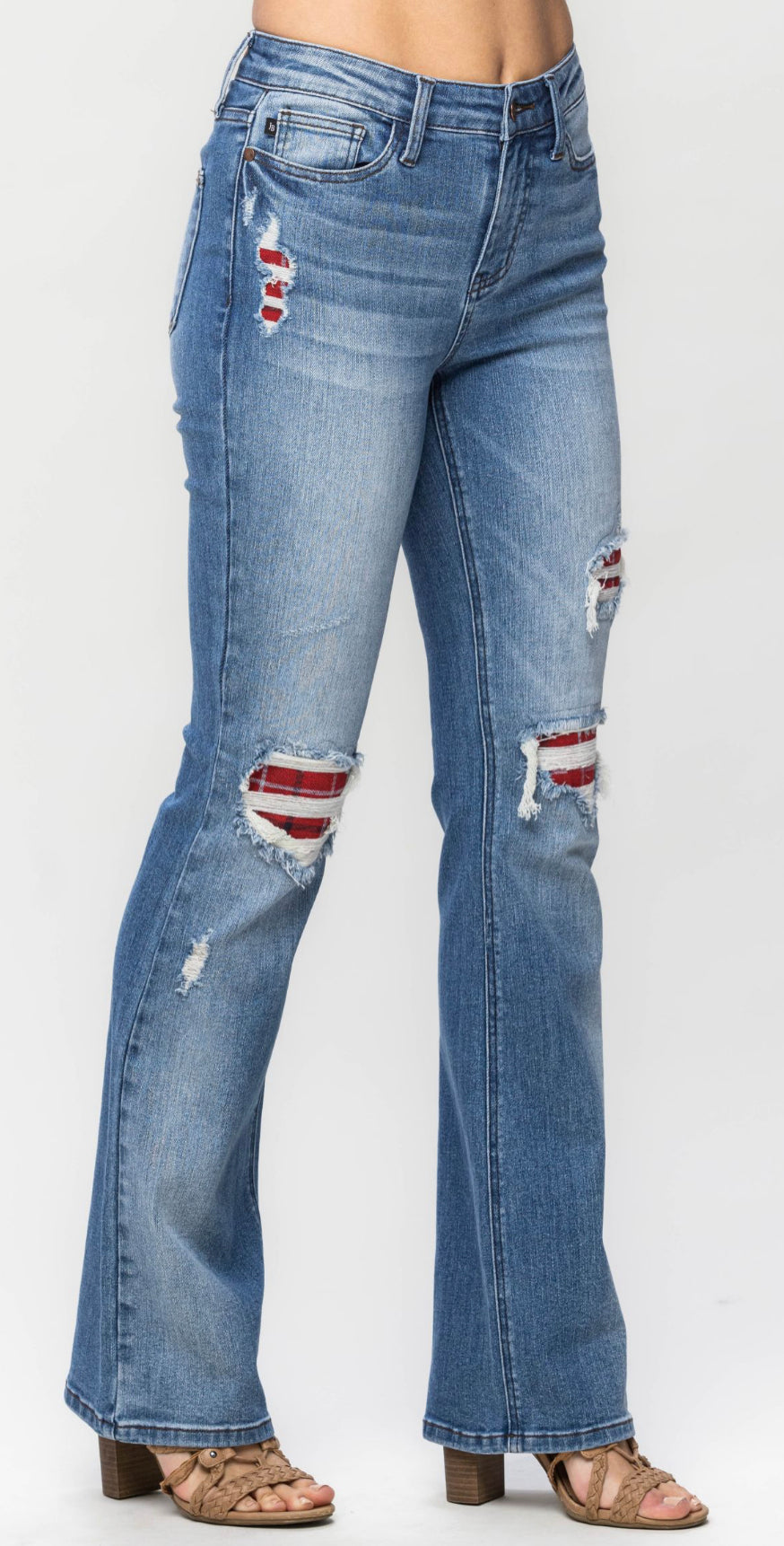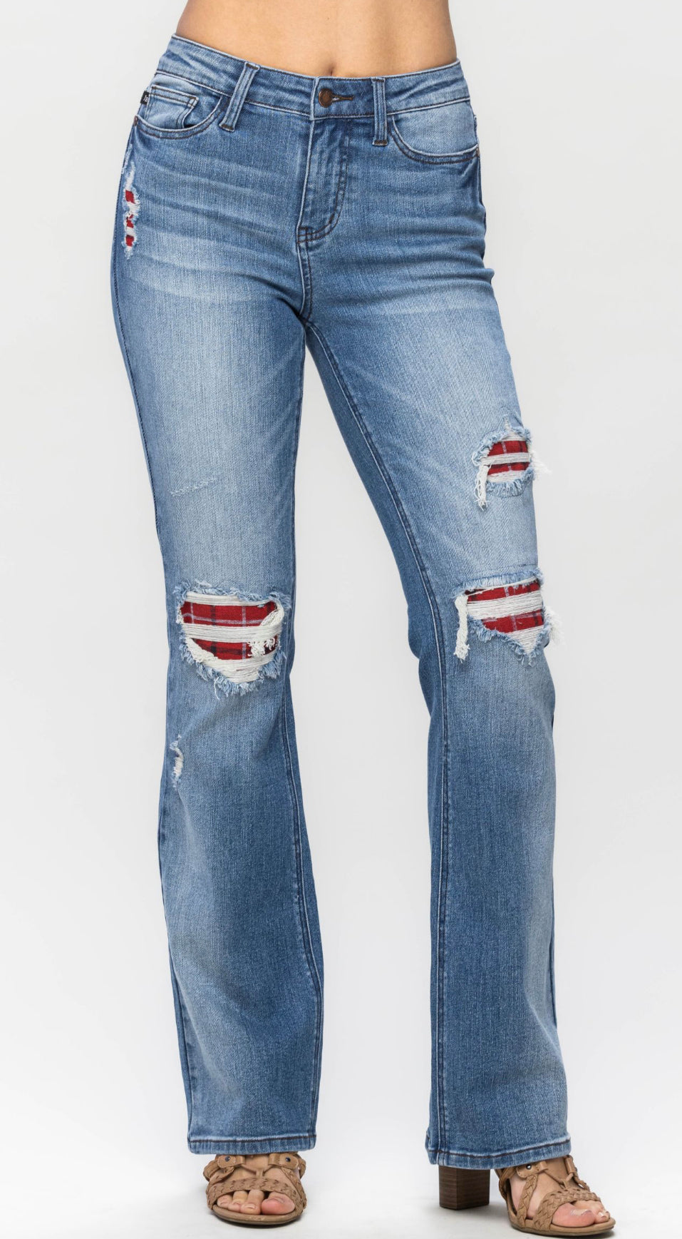 We are loving this style of Judy's! Slim but wider leg boot cut with red plaid patches in the distressed areas! Stretchy like you love!