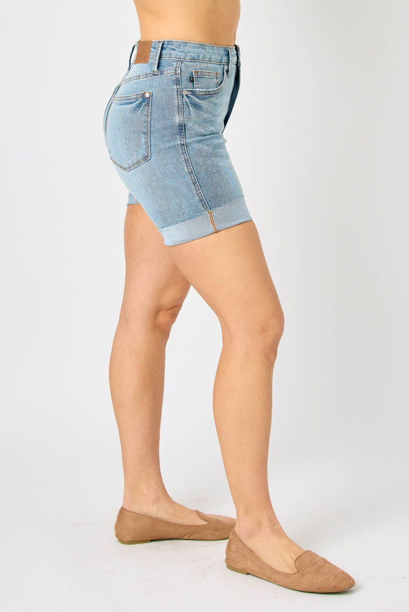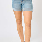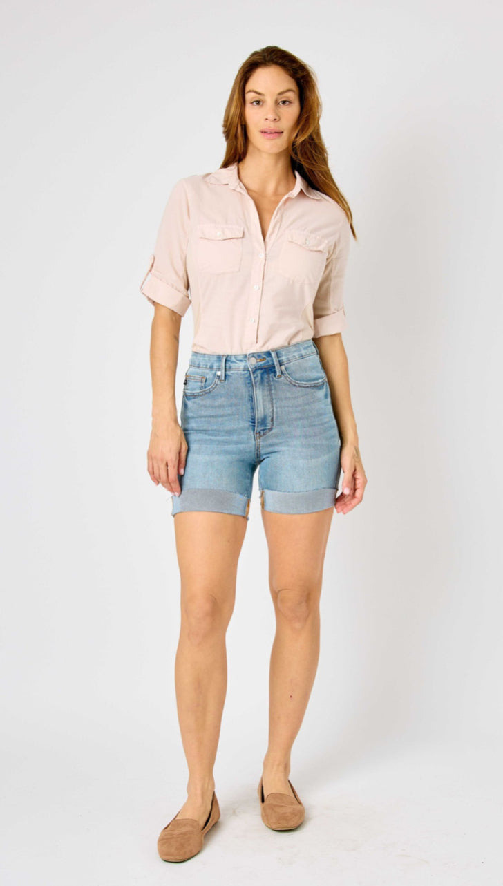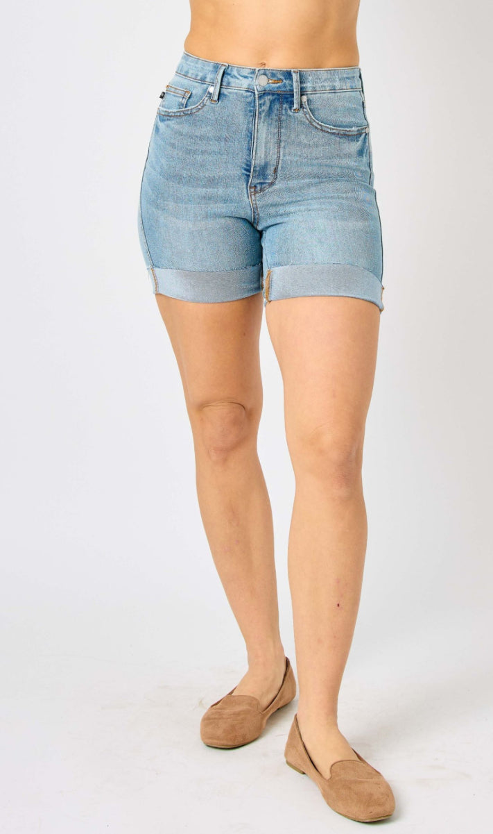 Introducing our top-rated tummy control denim shorts! Made with moisture-wicking fibers, these shorts will keep you cool and dry even in the hottest weather. The unique evaporative cooling feature releases heat and moisture, helping you stay comfortable all day long. With a 12 1/4" rise and customizable inseam length, these shorts are perfect for any body type. (Cuffed or uncuffed, it's up to you!)
