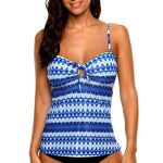 This playful tankini set includes a blouson top with adjustable straps and a comfy padded bra. The two-piece design has a side tie for a perfect fit and a lined bottom offering moderate coverage.