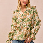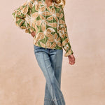 This blouse features a bold olive and cream floral print that brings fresh energy to your wardrobe. Ruffled details on the shoulders and cuffs add a flirty touch, perfect for adding a bit of fun to any outfit. Lightweight and charming, it’s an easy way to brighten your day with style.